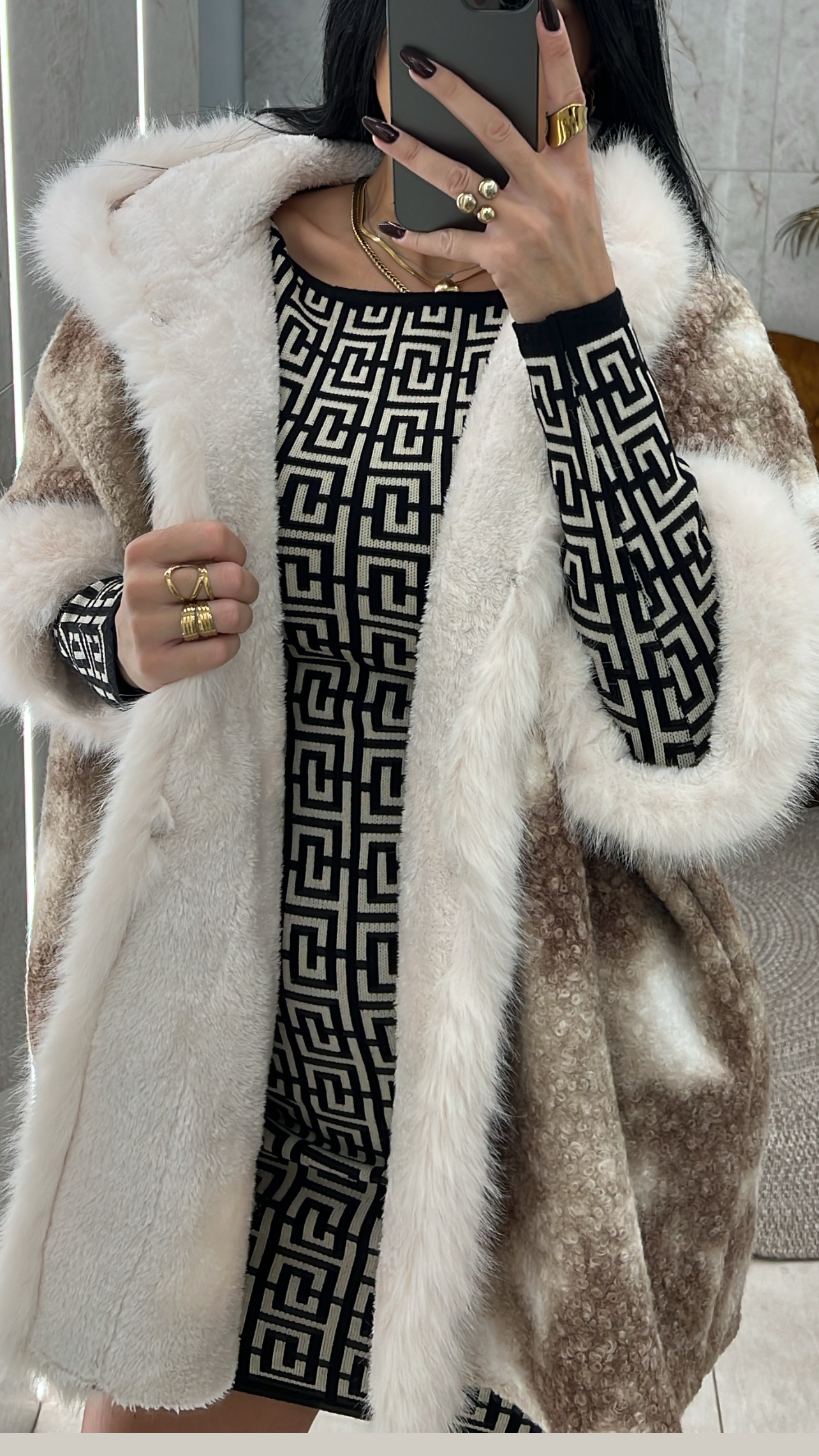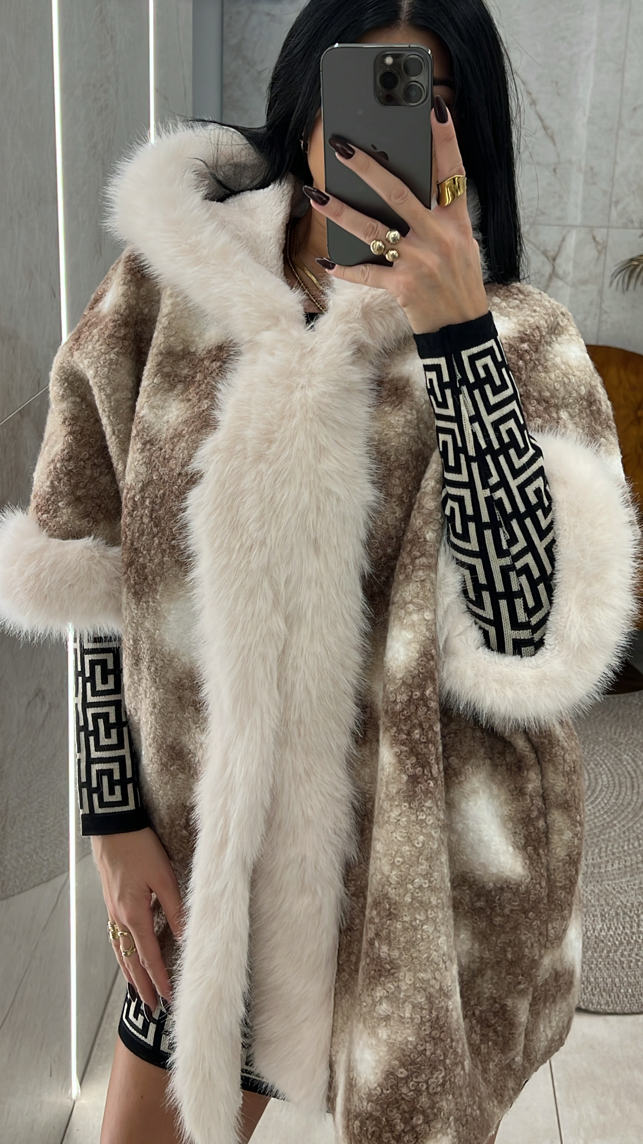 Παλτό με λεπτομέρειες από γούνα στον γιακά και στα μανίκια. Διαθέτει κουκούλα, τσέπες και εσωτερική επένδυση από γούνα. Κλείνει με κόπιτσες.