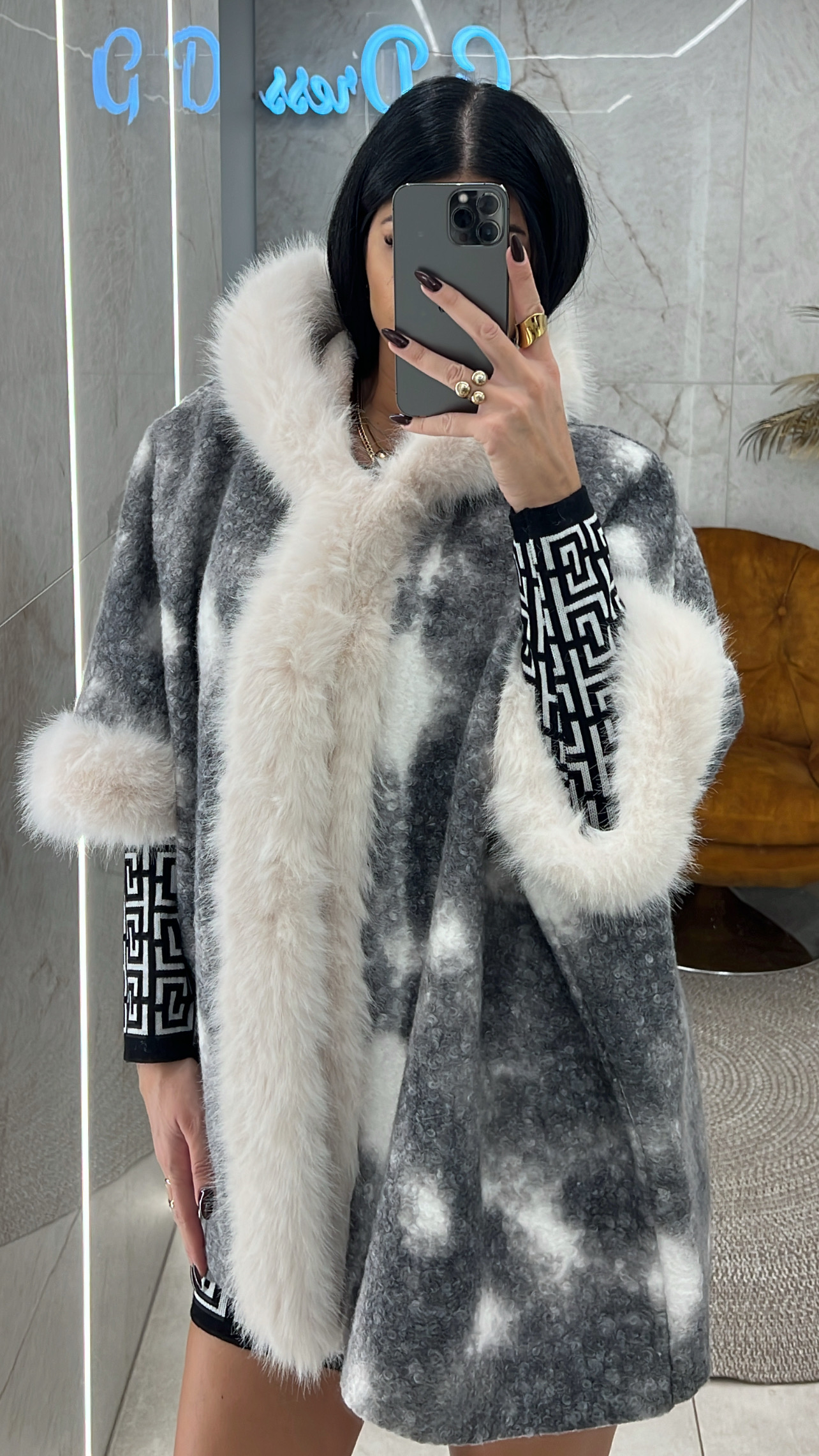 Παλτό με λεπτομέρειες από γούνα στον γιακά και στα μανίκια. Διαθέτει κουκούλα, τσέπες και εσωτερική επένδυση από γούνα. Κλείνει με κόπιτσες.