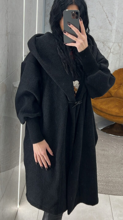Παλτό oversized με κουκούλα κλείνει με κοκάλινο κουμπί και διαθέτει τσέπες και λάστιχο στις μανσέτες
