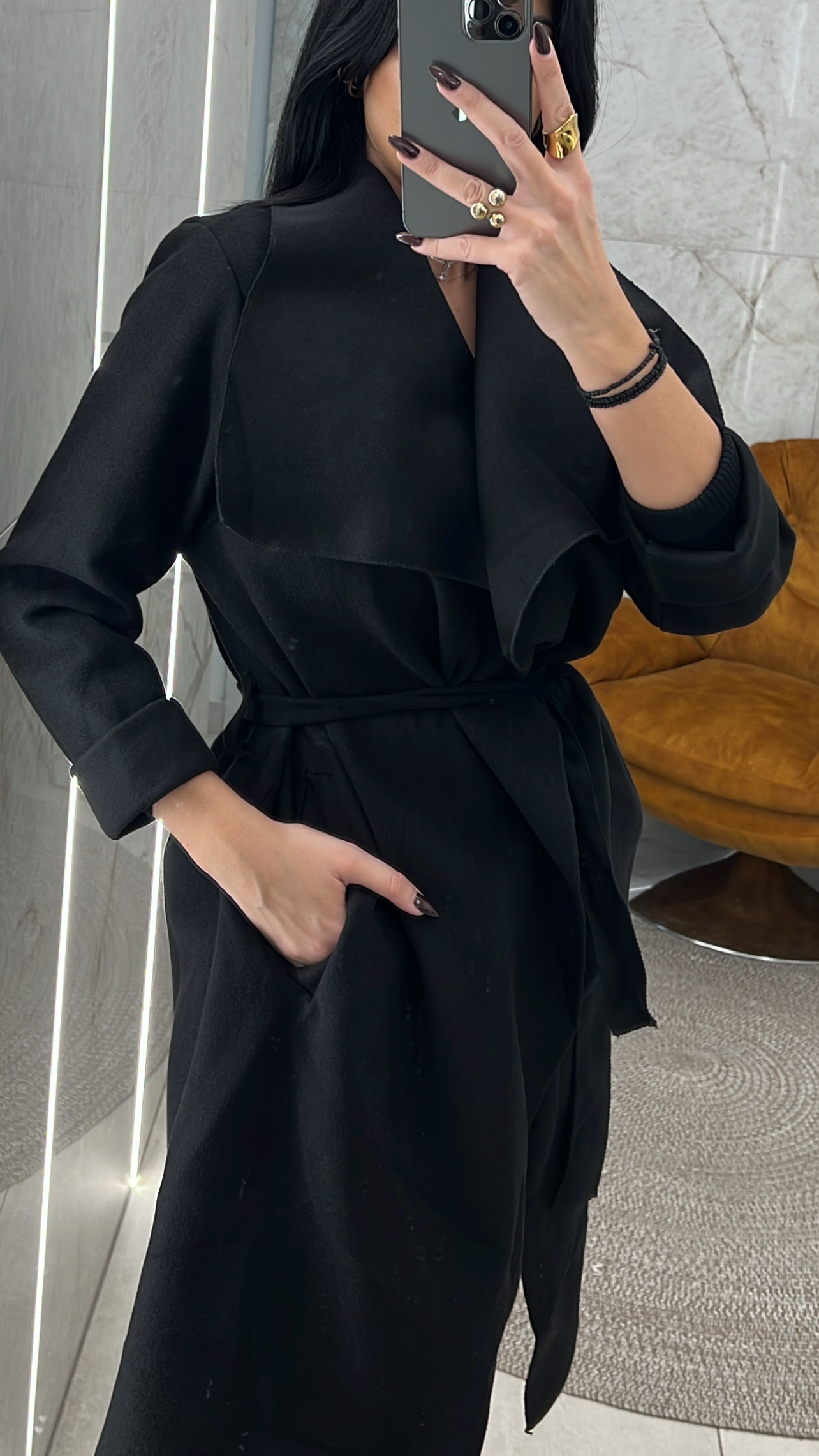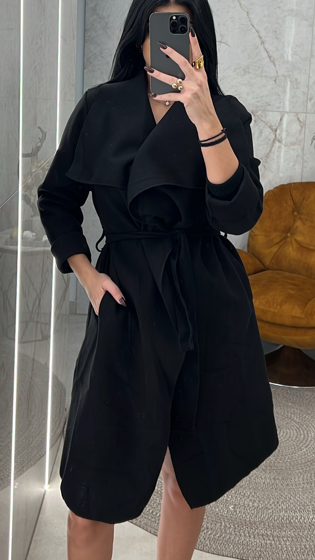 Παλτό τσόχα με γιακά τσέπες και διαθέτει και δική του ζώνη