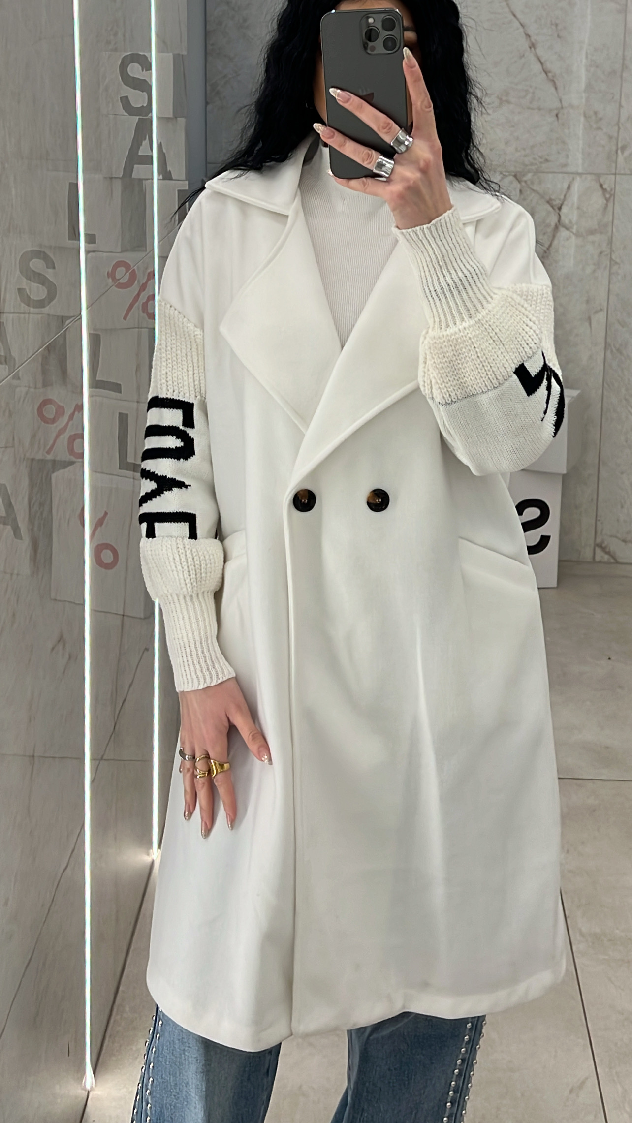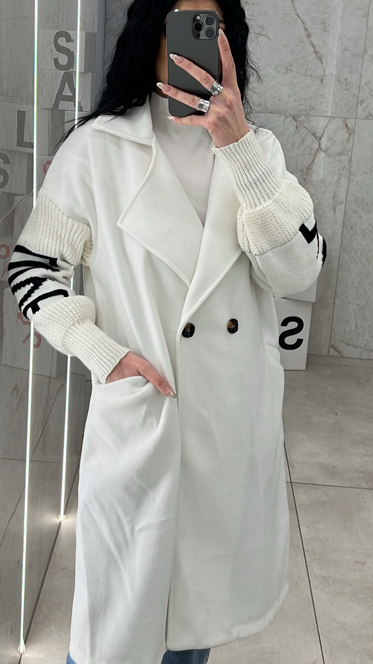 Παλτό τσόχα με πλεκτά μανίκια ,κλείνει με κουμπί ,έχει τσέπες και δεν διαθέτει εσωτερική φόδρα.