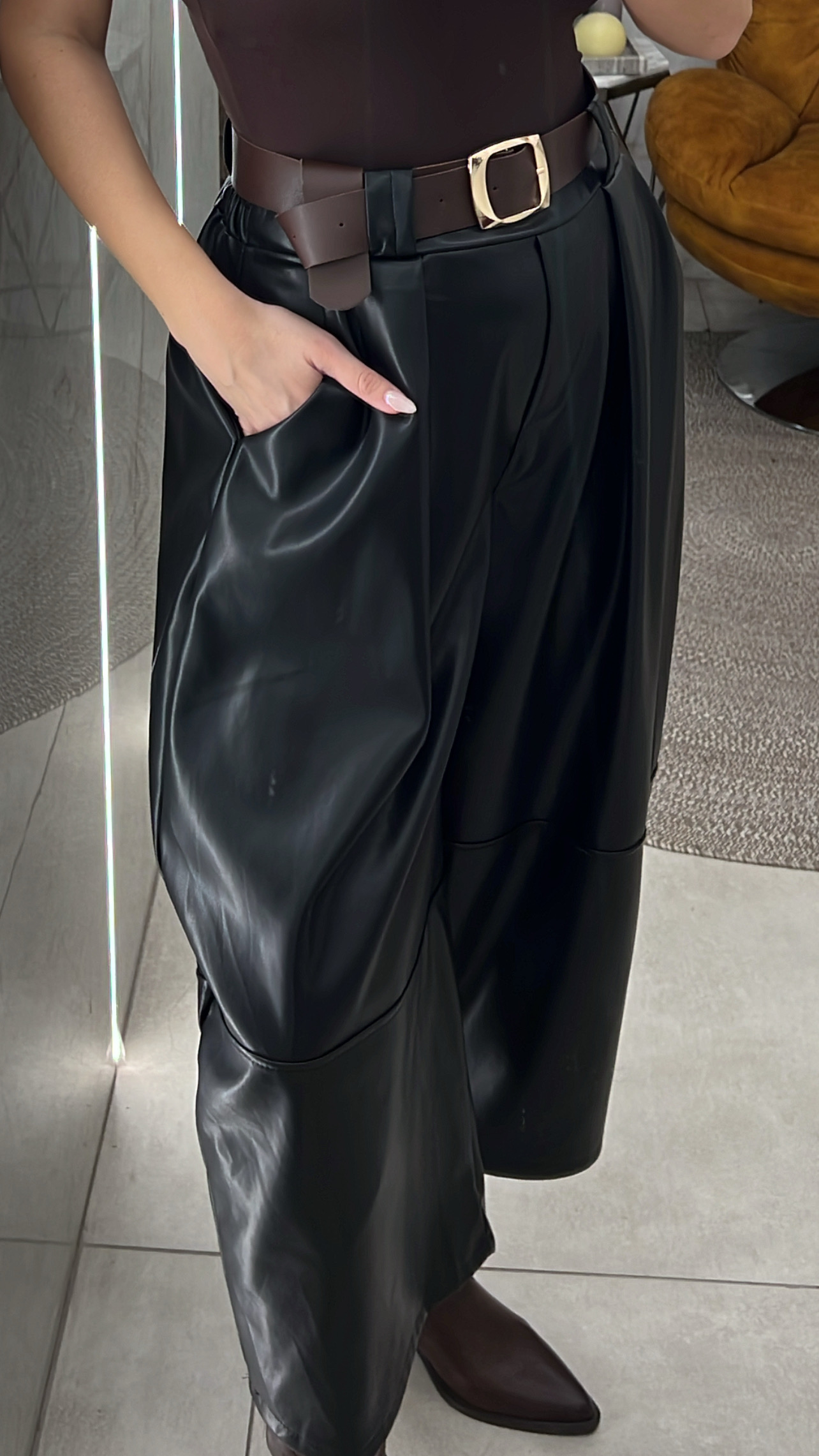 Παντελόνα κάπρι δερματίνη με επένδυση εσωτερικά λάστιχο στην μέση και δική της ζώνη