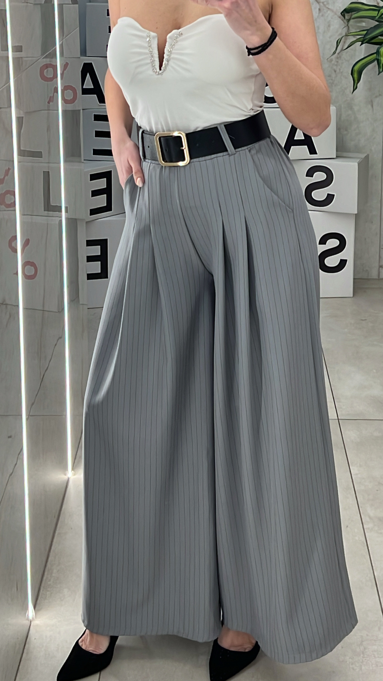 Παντελόνα ριγέ με δική της ζώνη, λάστιχο στην μέση και τσέπες .