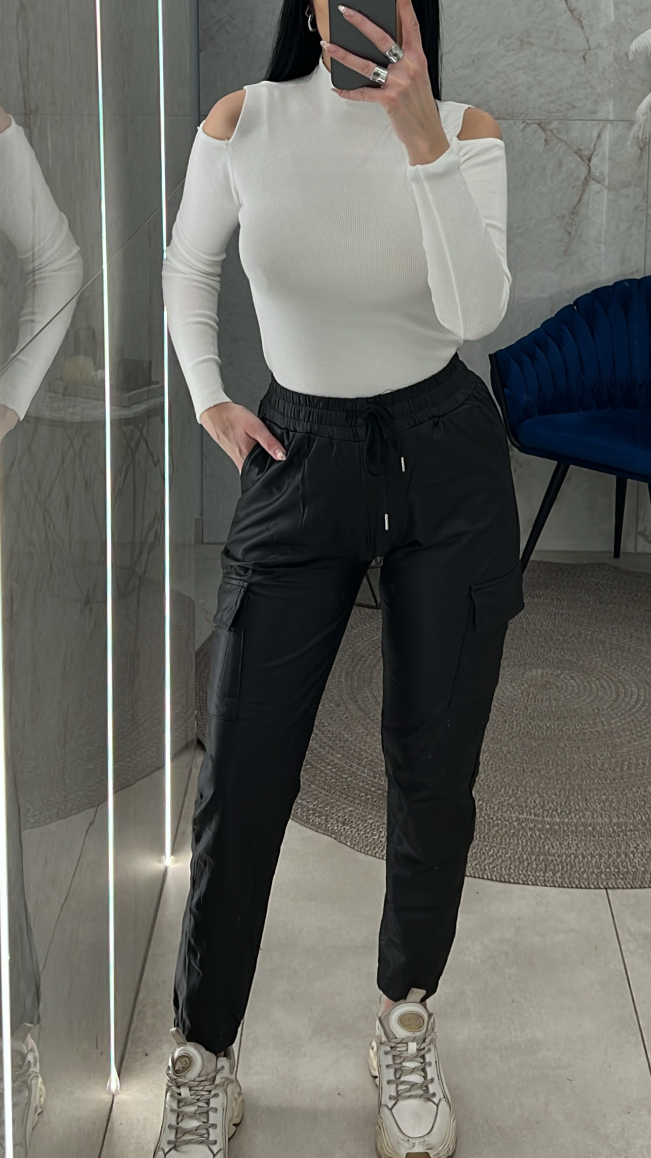 Παντελόνι δερματίνι cargo με λάστιχο στη μέση και κορδόνι και τσέπες μπροστά και στο πλάι
