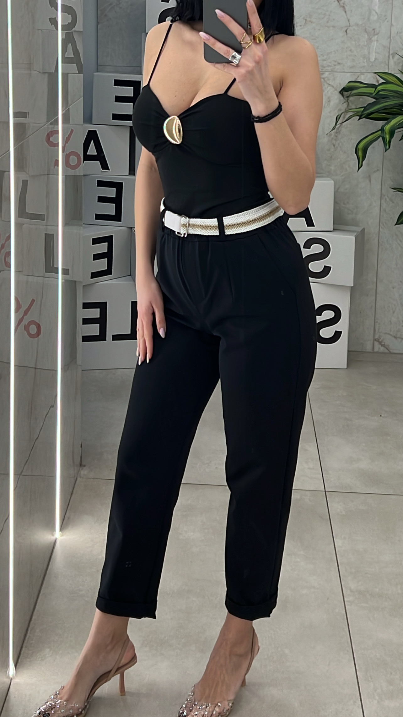 Παντελόνι με δική του ζώνη , τσέπες και λάστιχο στην μέση .