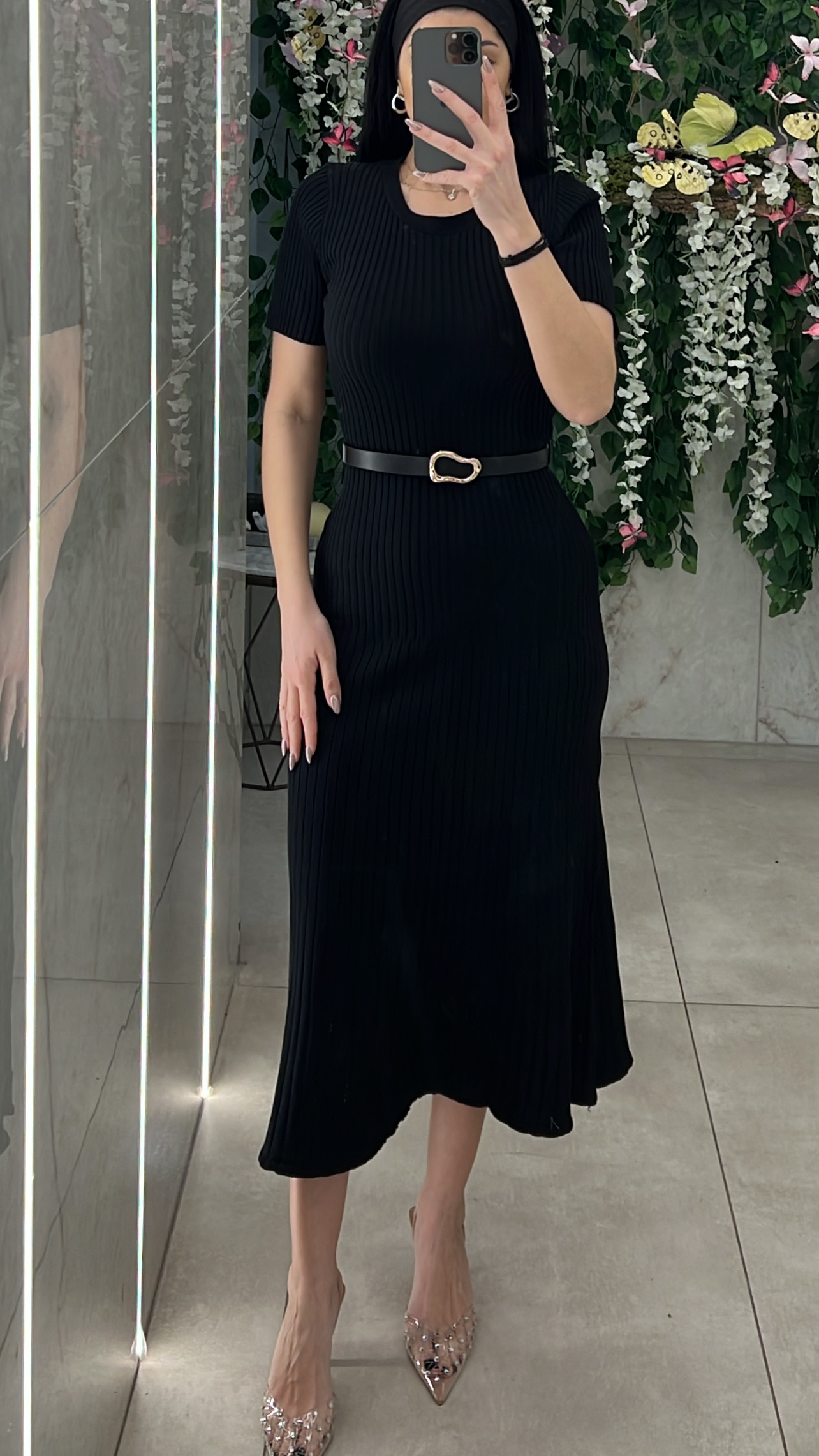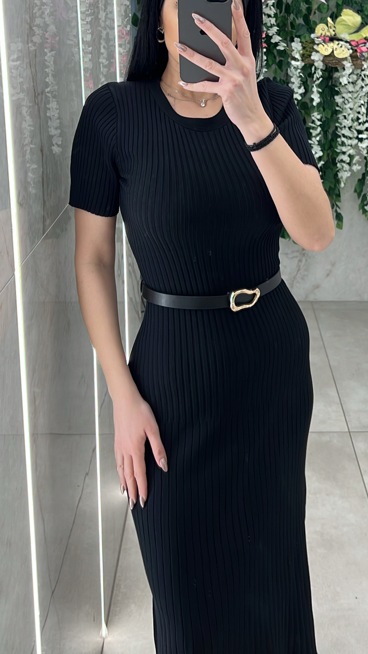 Πλεκτο ριπ φόρεμα κοντομάνικο ,με λαιμοκοψη, με δική του ζώνη και ανοιγει λιγο στο τελειωμα .