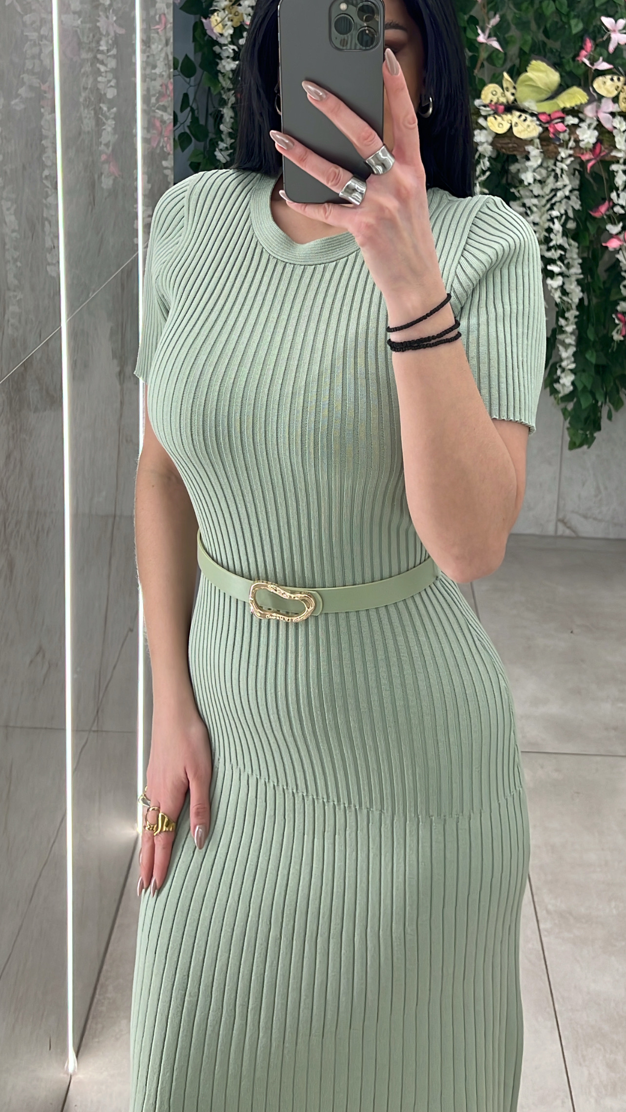 Πλεκτο ριπ φόρεμα κοντομάνικο ,με λαιμοκοψη, με δική του ζώνη και ανοιγει λιγο στο τελειωμα .
