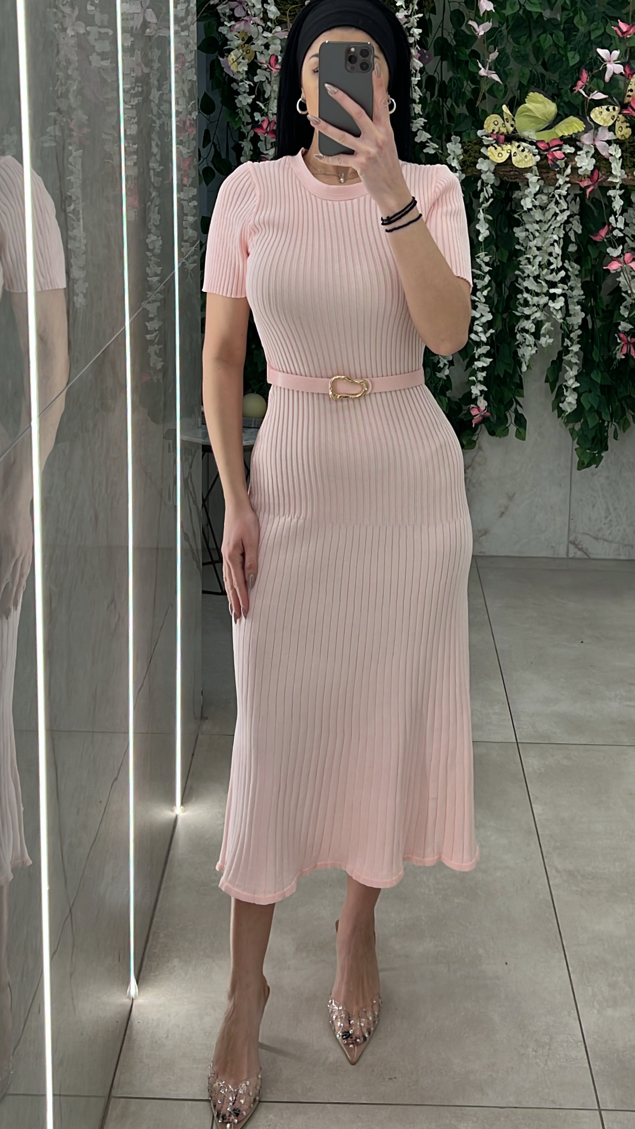 Πλεκτο ριπ φόρεμα κοντομάνικο ,με λαιμοκοψη, με δική του ζώνη και ανοιγει λιγο στο τελειωμα .