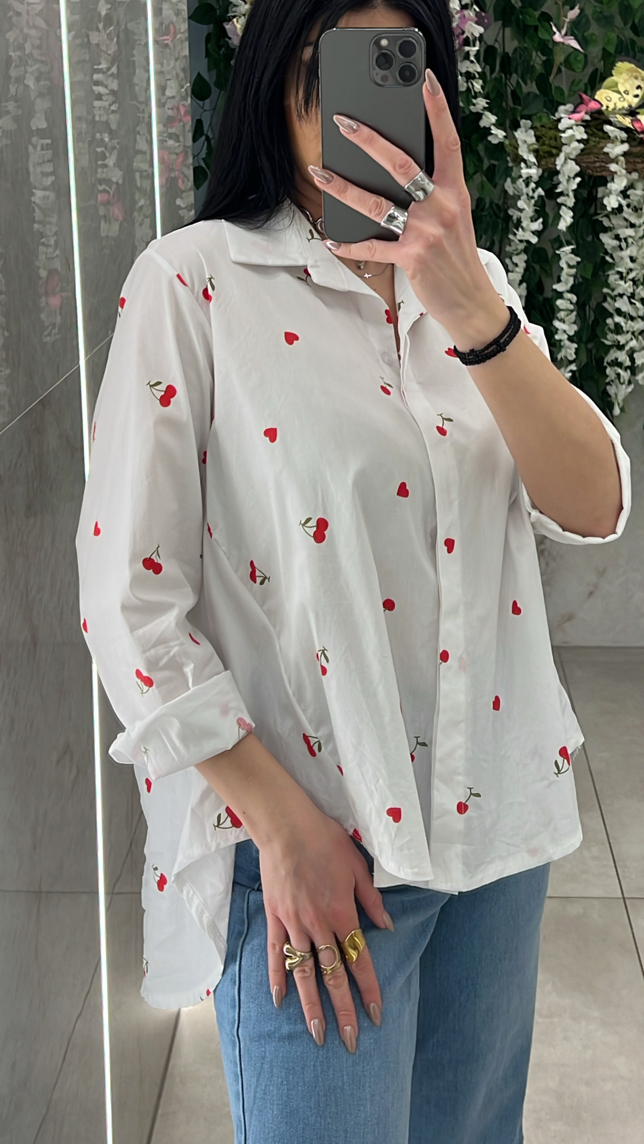 Πουκάμισο με σχεδιο καρδιες και κερασια ,ειναι πιο κοντο μπροστα και πιο μακρυ πισω .