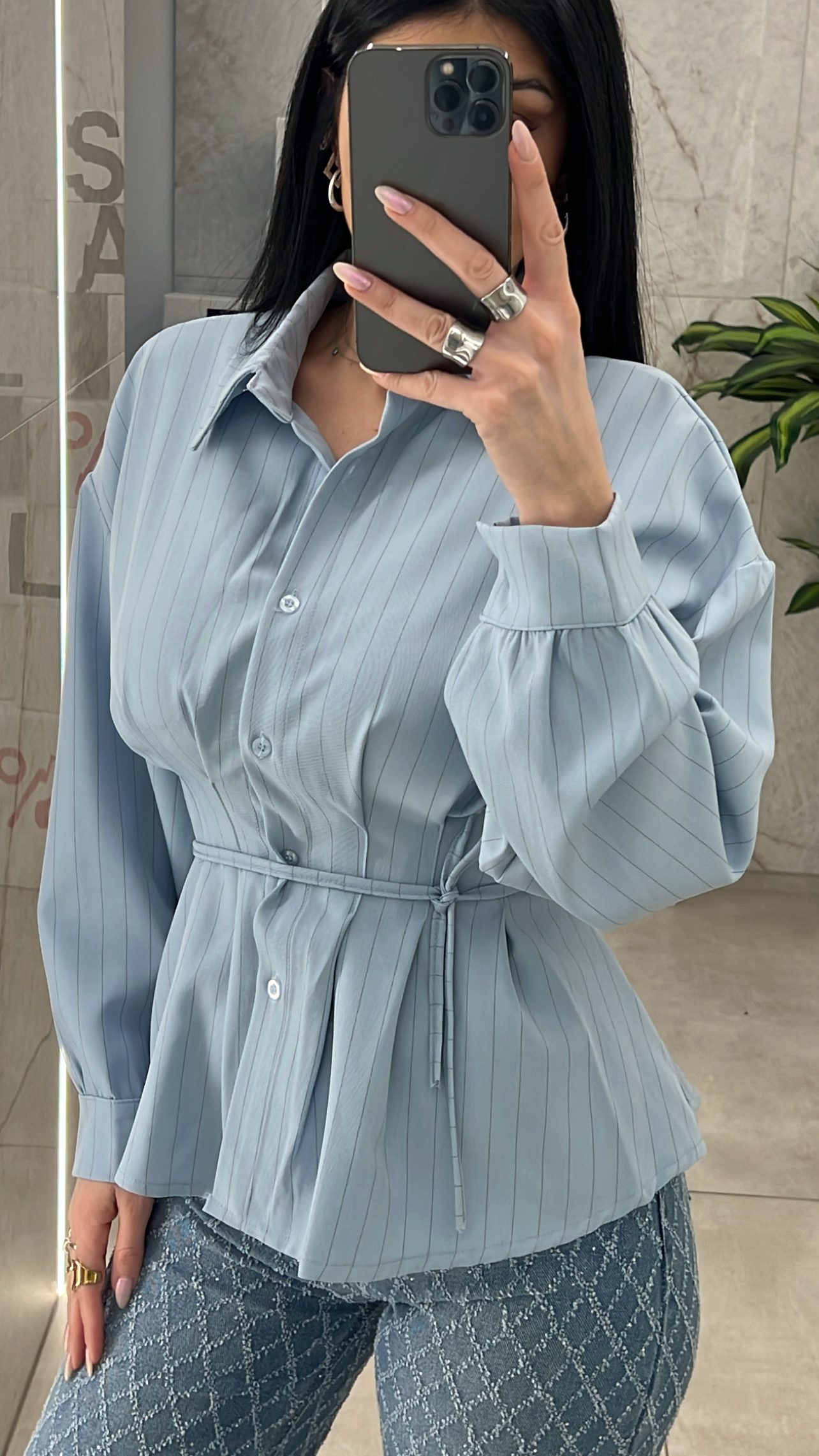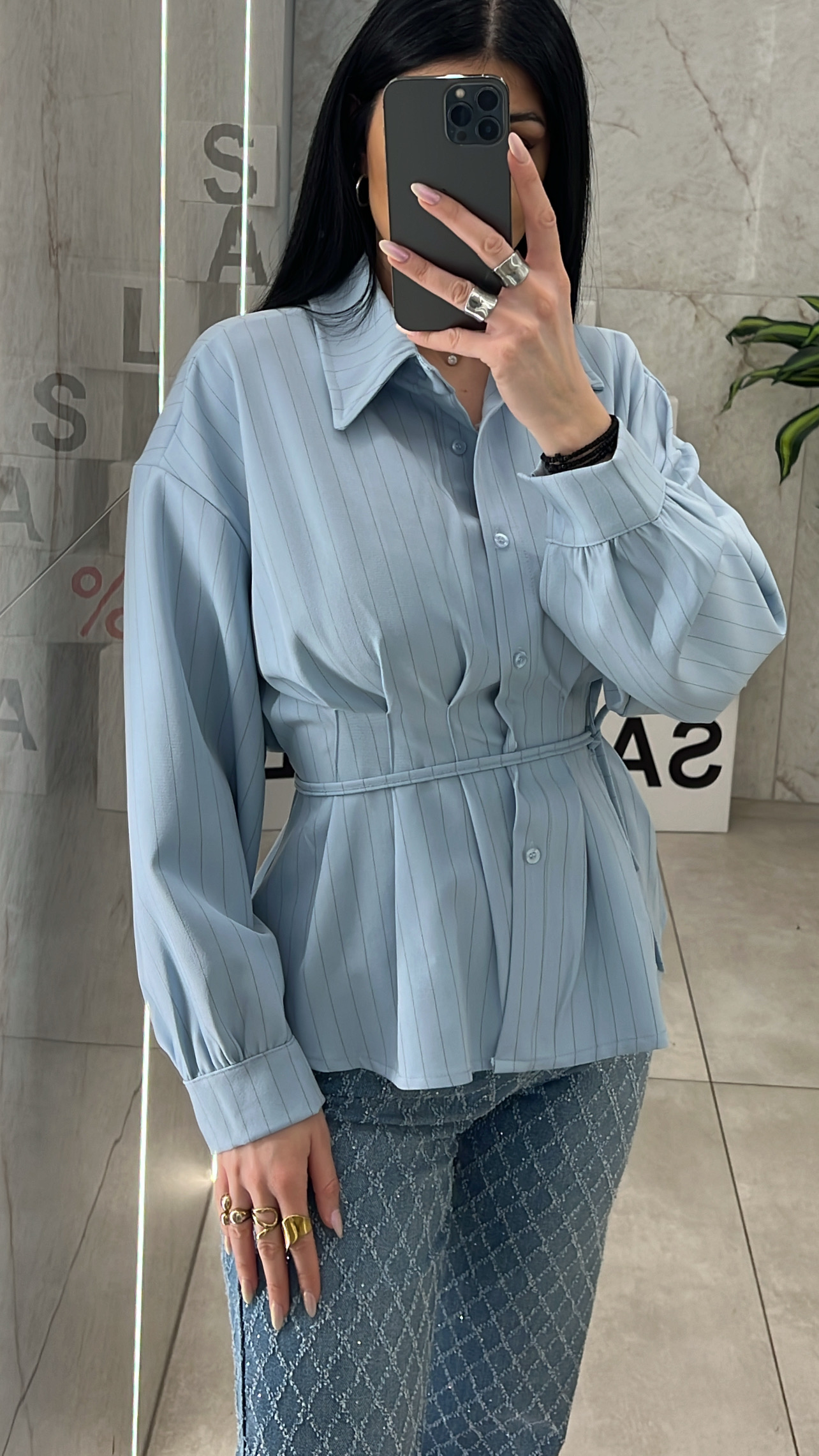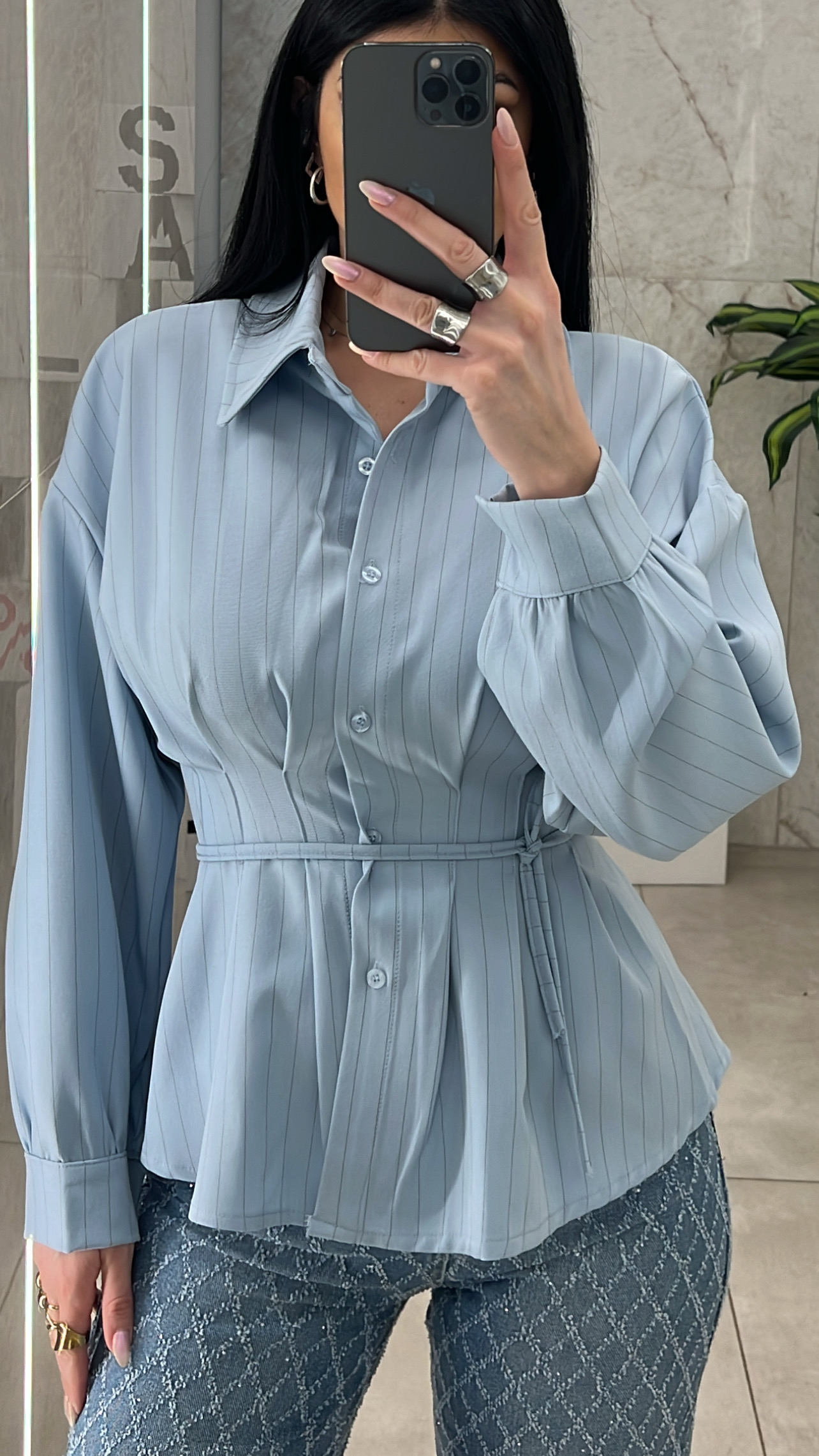 Πουκάμισο ριγέ με πιέτες στην μέση και κόρδονι που δένει με διάφορους τρόπους .