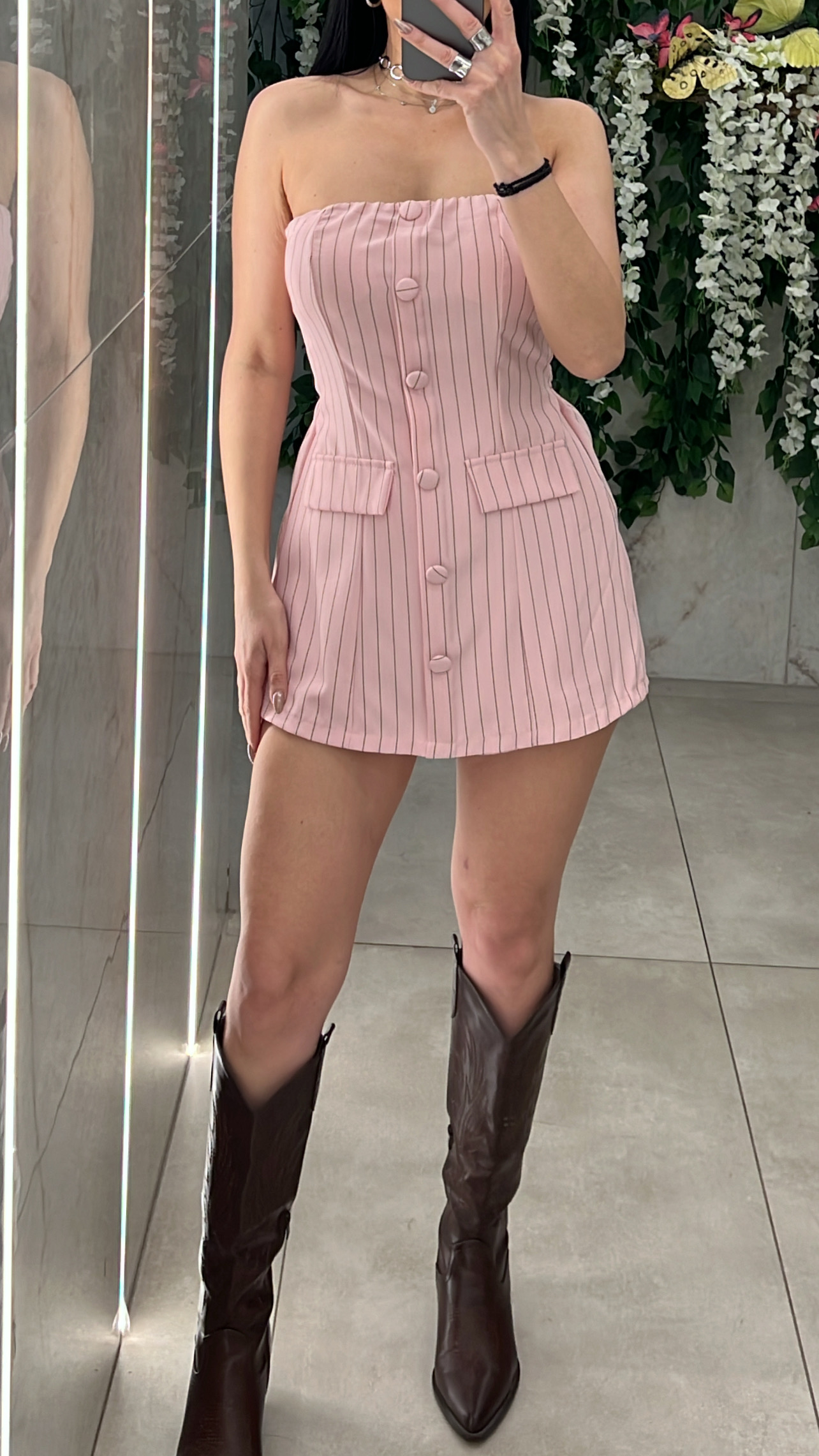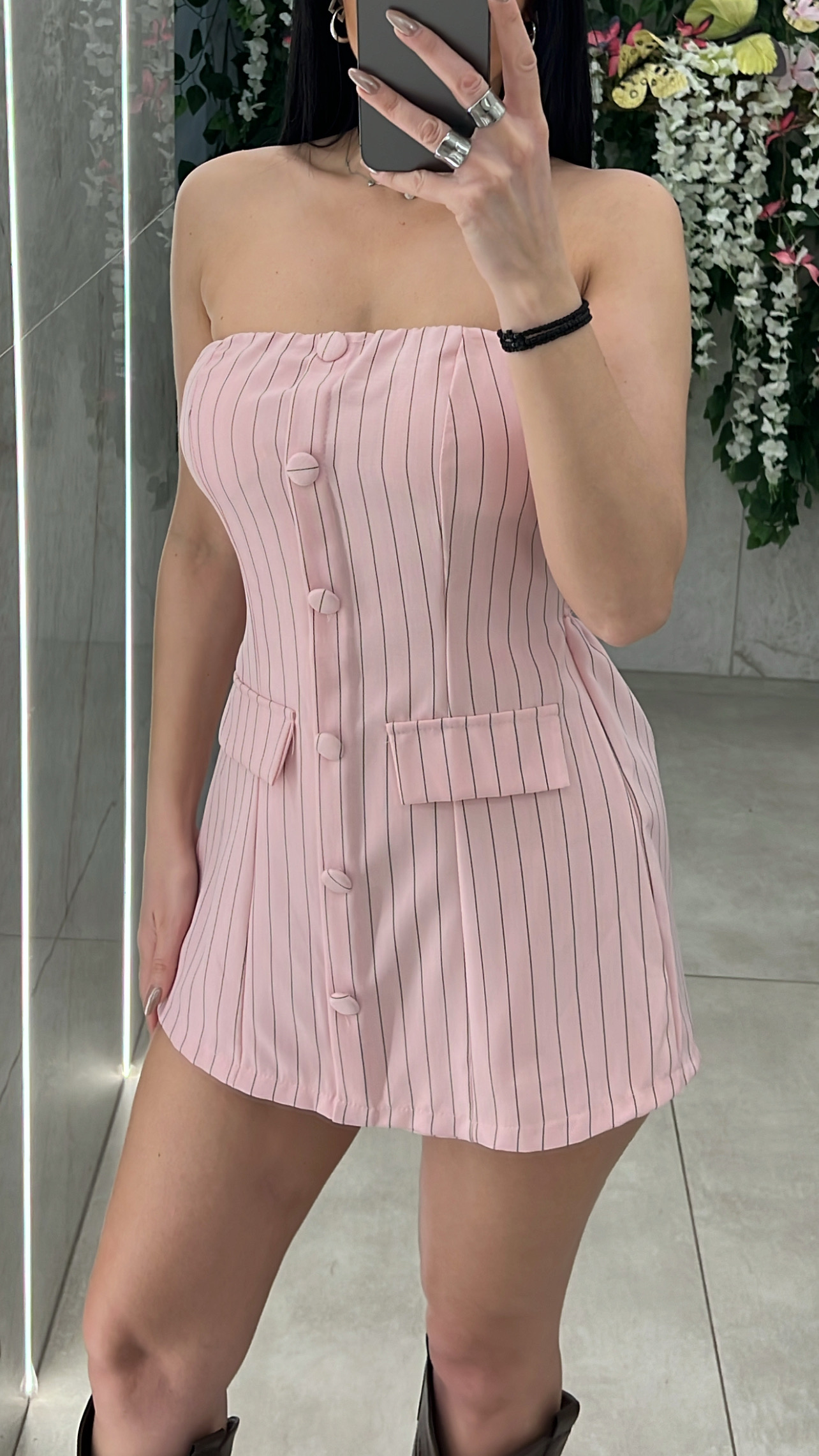 Ριγε ολόσωμo σορτσ- φόρεμα στραπλες ,διαθετει διακοσμητικες τσέπες και κουμπια και λάστιχο στην πλατη .
