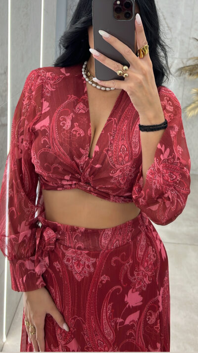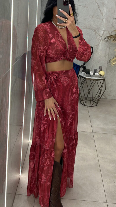 Σετ boho μπορντώ το τοπ δένει πίσω και η φούστα δένει στο πλάι έχει λάστιχο στην μέση και διαθέτει φόδρα από μέσα