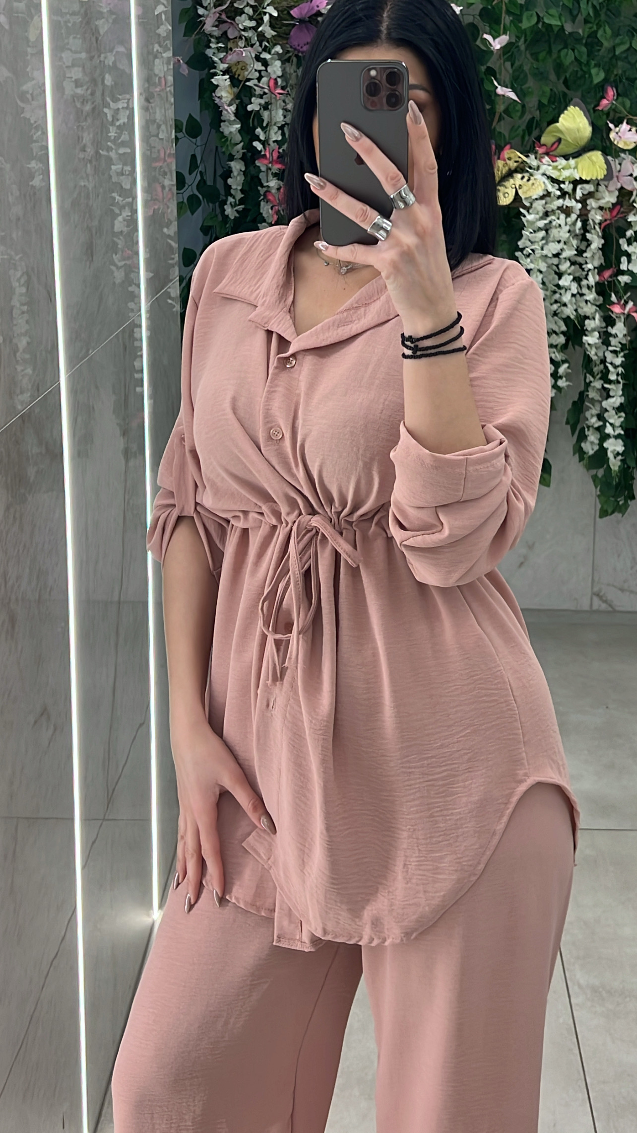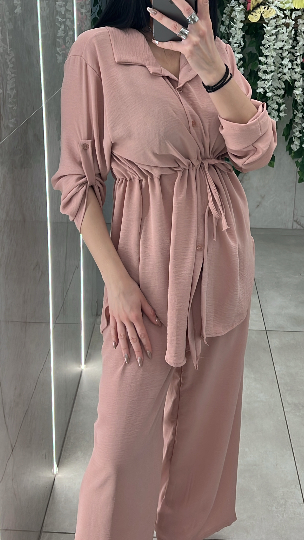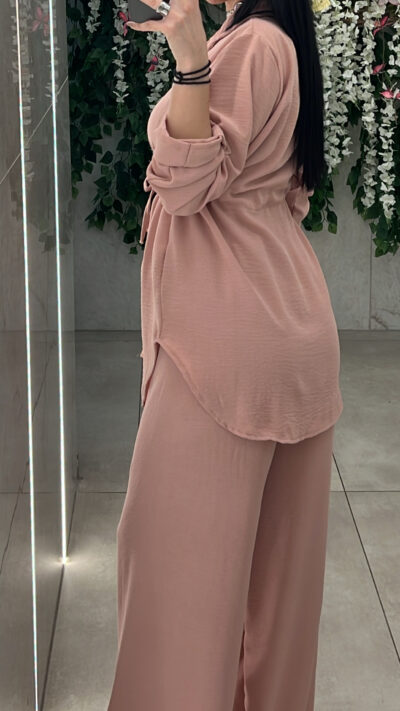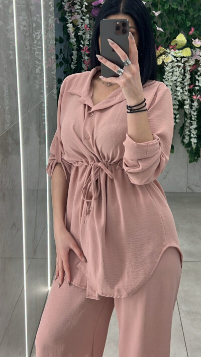 Σετ casual ,αποτελειται απο πουκάμισο με κορδονι στην μέση για προσαρμογη και παντελόνα με λάστιχο στην μέση .