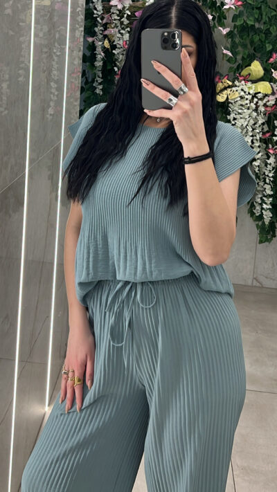 Σετ casual πλισε , μπλουζα κοντομάνικι με λαιμοκοψη κανει ανοιγμα στο τελειωμα και παντελόνα με λάστιχο και κορδόνι στην μέση .