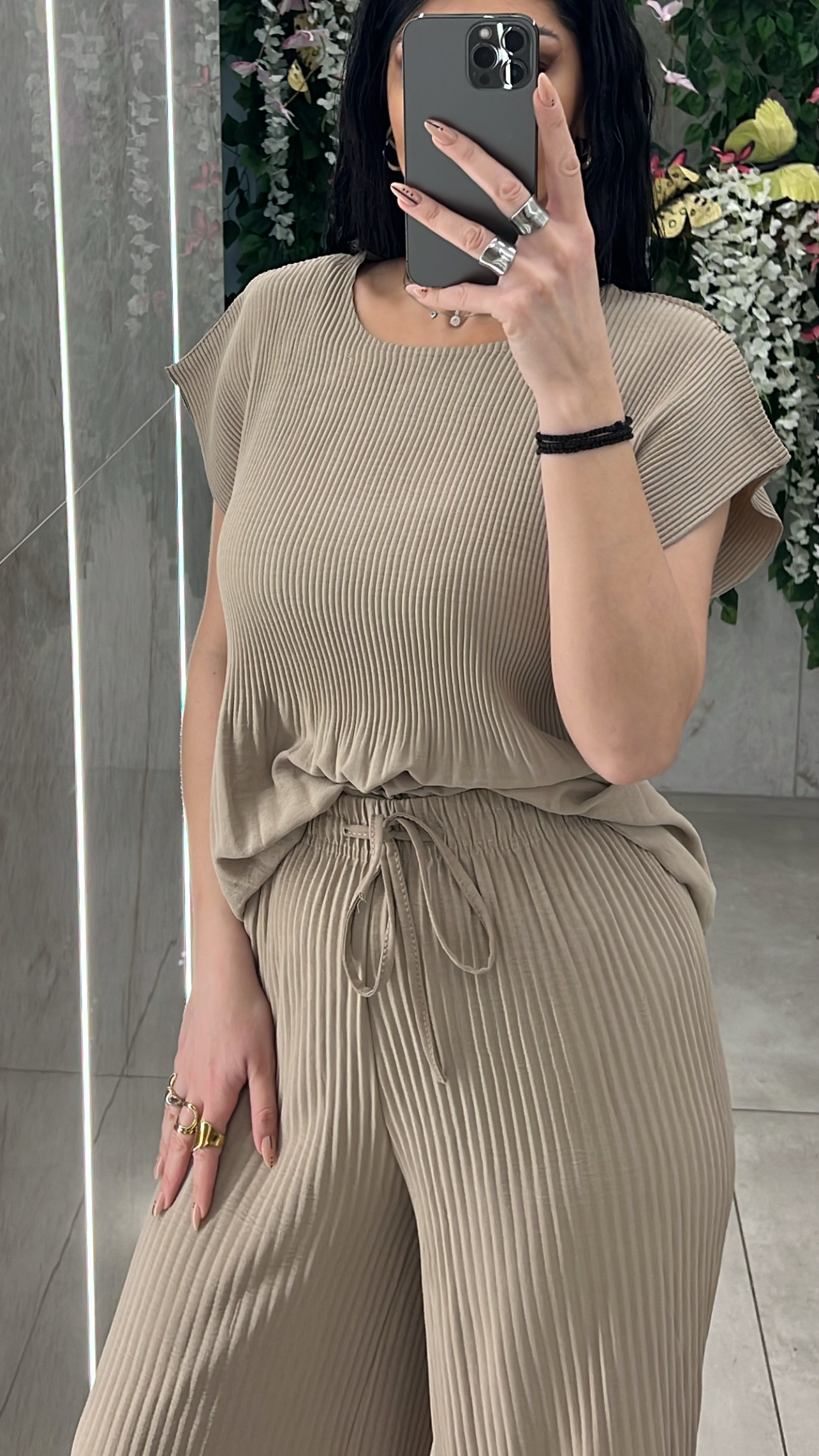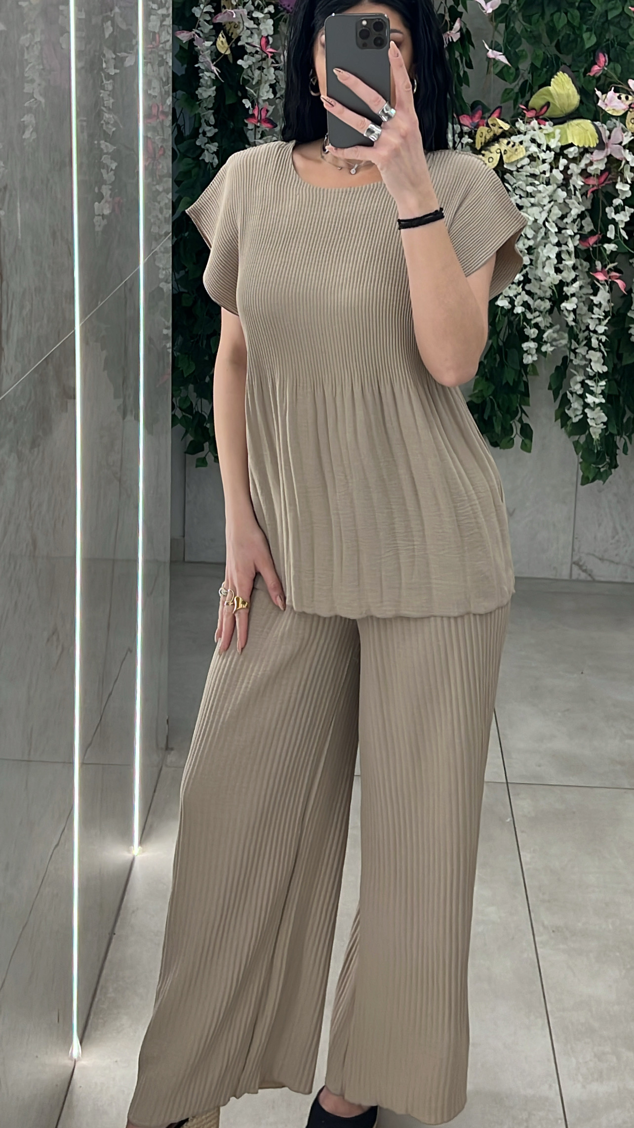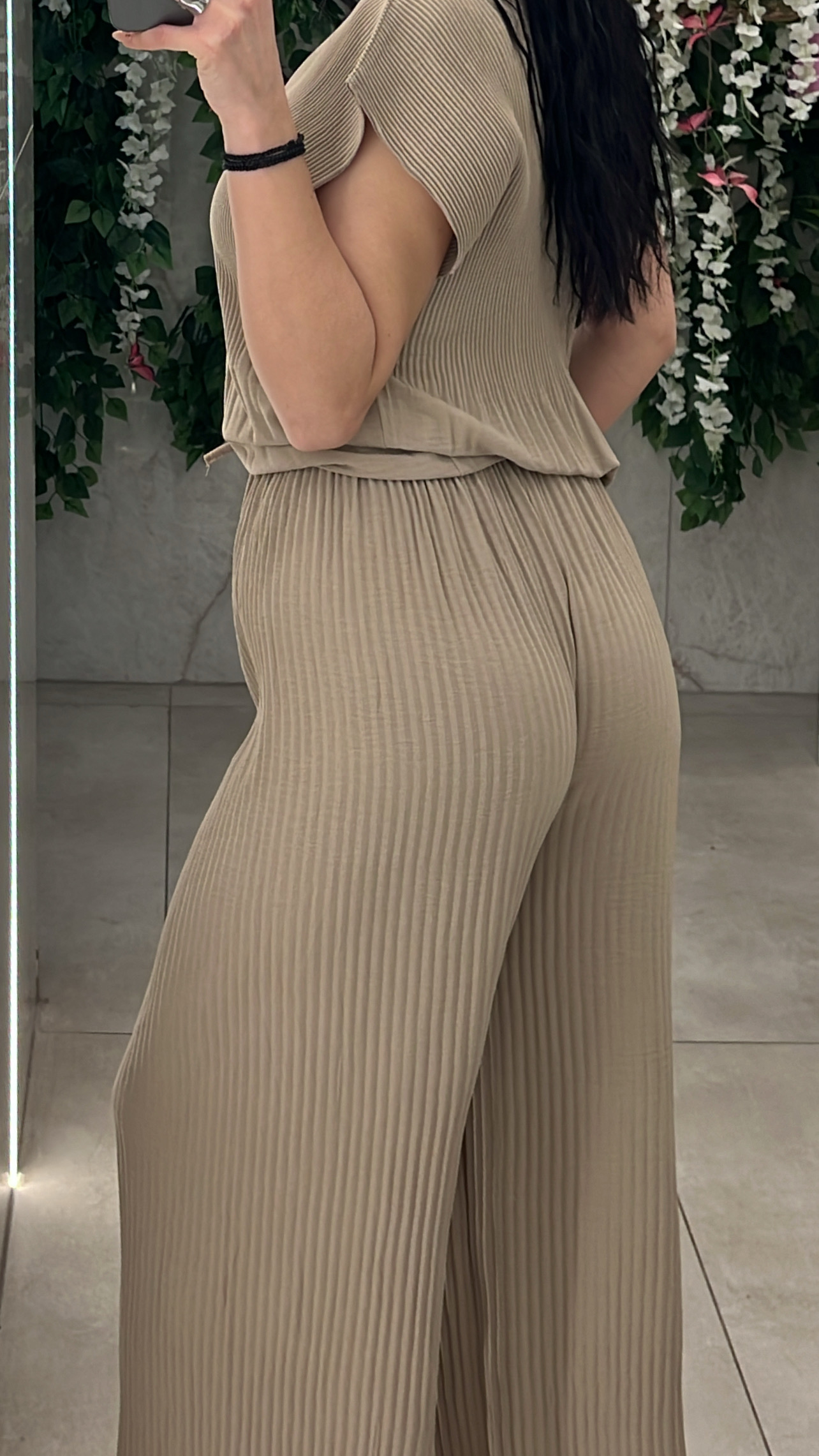 Σετ casual πλισε , μπλουζα κοντομάνικι με λαιμοκοψη κανει ανοιγμα στο τελειωμα και παντελόνα με λάστιχο και κορδόνι στην μέση .