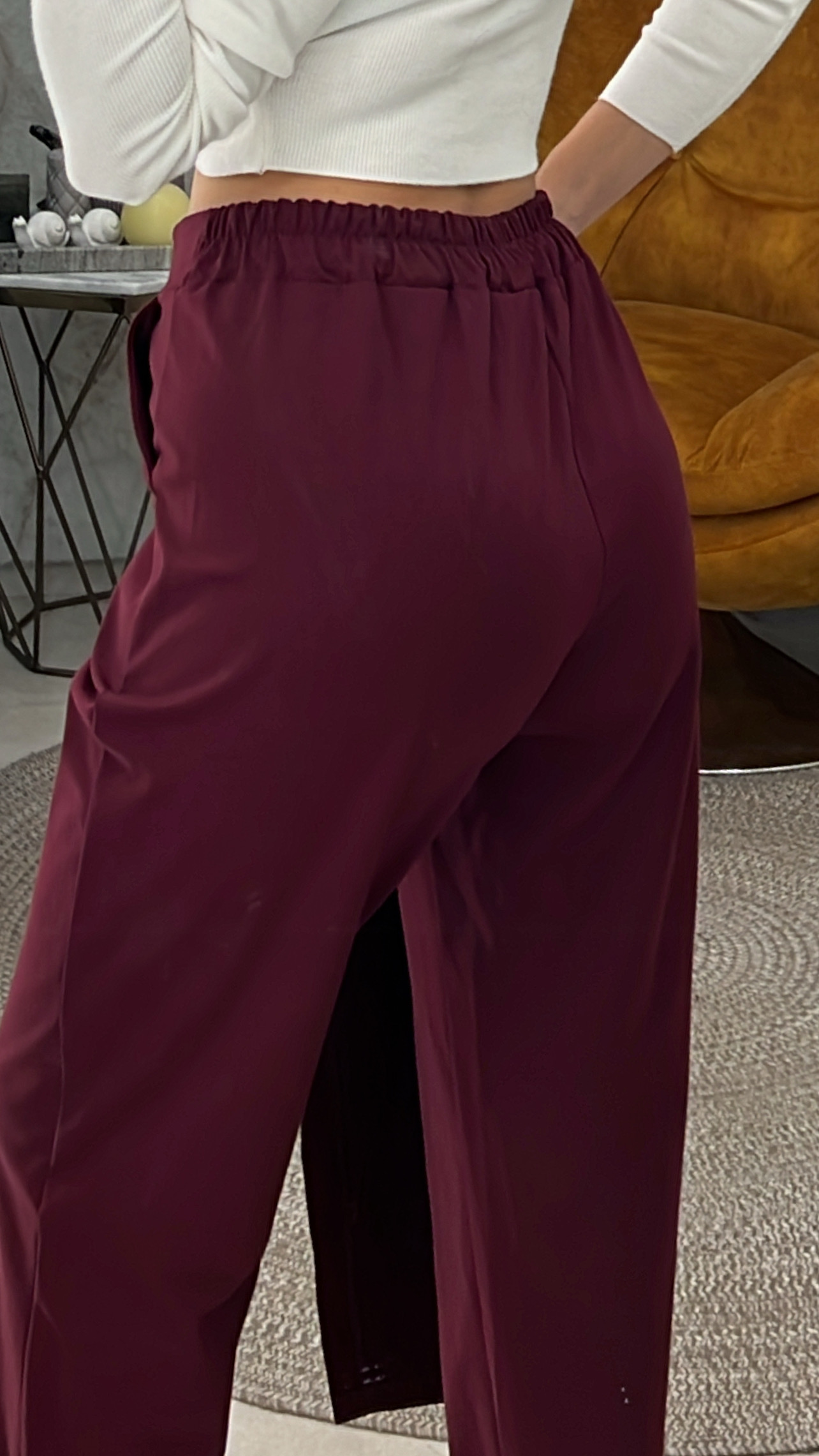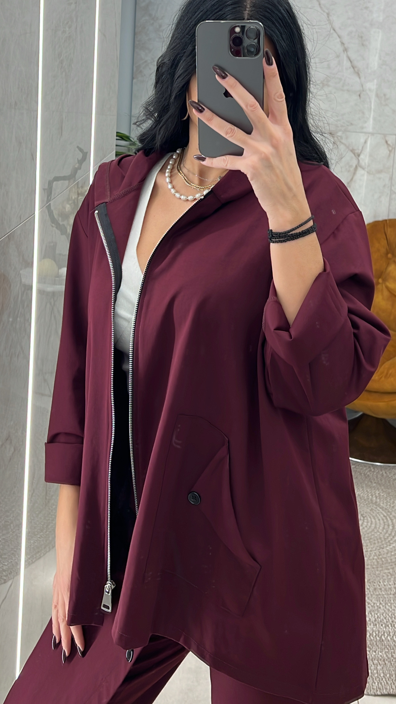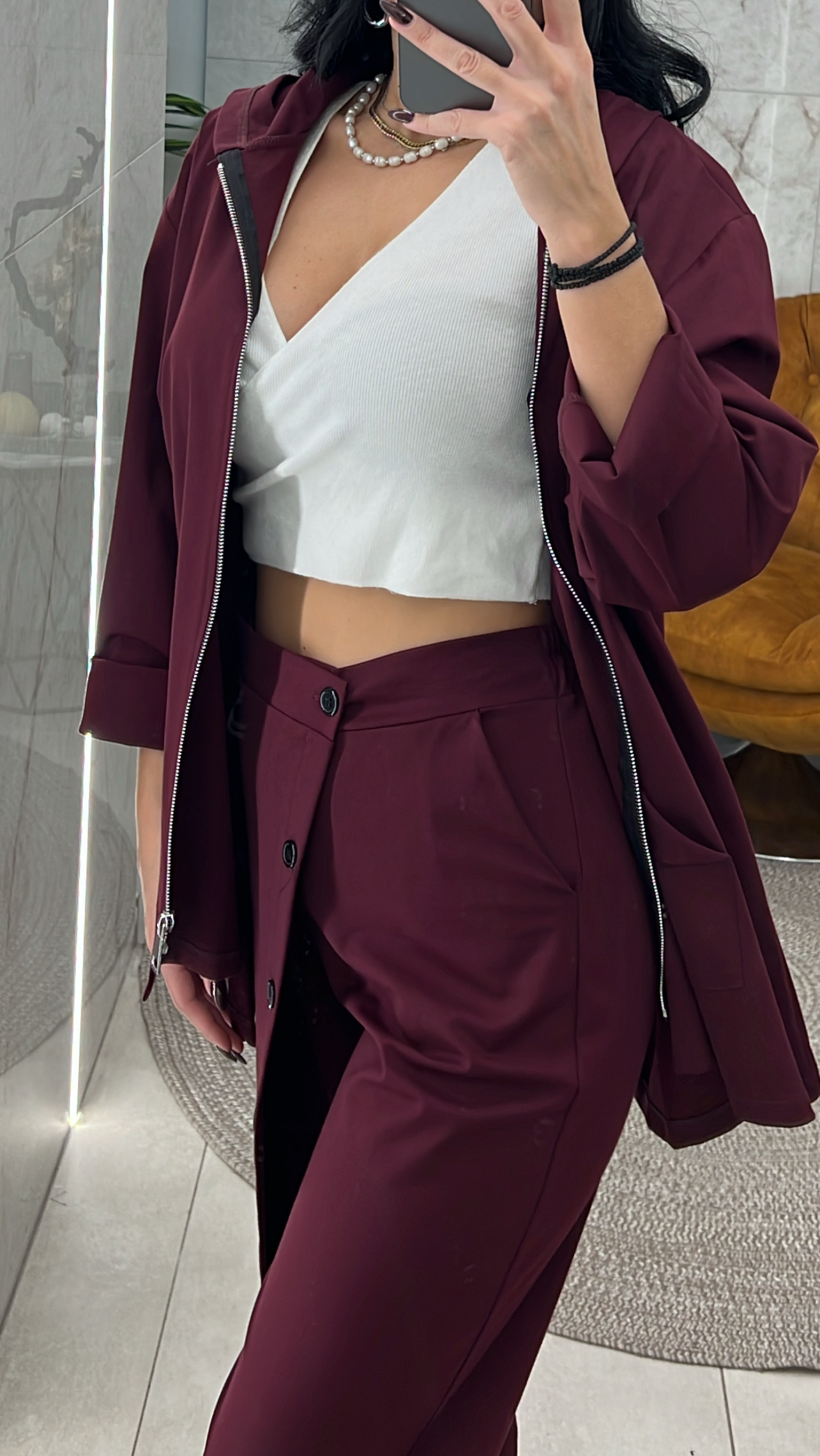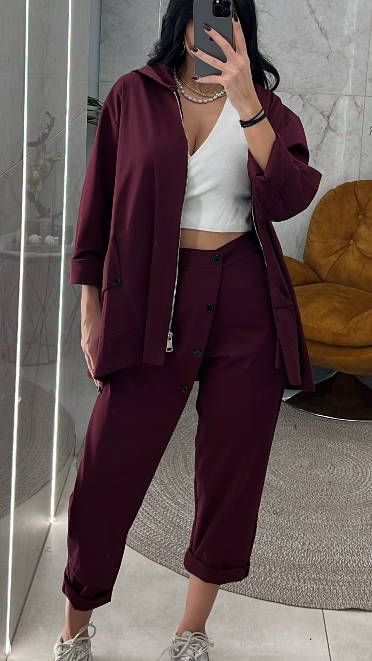 Σετ casual μπορντώ αποτελείται από παντελόνι τύπου σαλβάρι με διακοσμητικά κουμπιά μαύρα και λάστιχο στο πίσω μέρος στη μέση και από ζακέτα με κουκούλα και και τσέπες, κλείνει με φερμουάρ