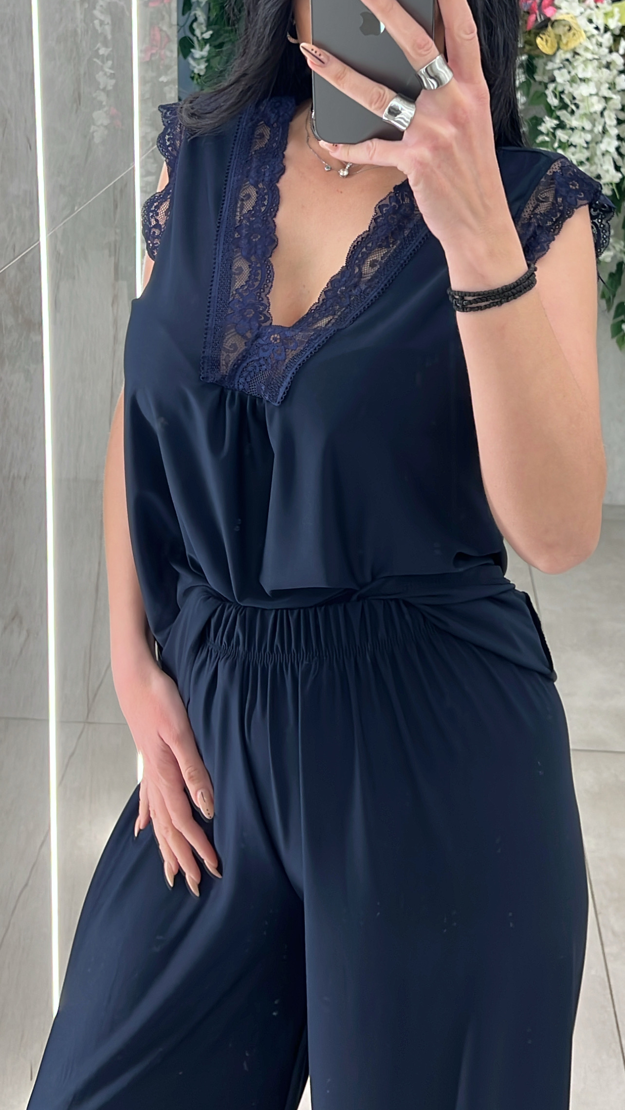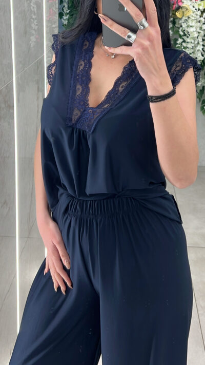 Σετ casual αποτελειται απο μπλουζα αμάνικη με λεπτομέρειες δαντελα και παντελόνα με λάστιχο στην μέση .