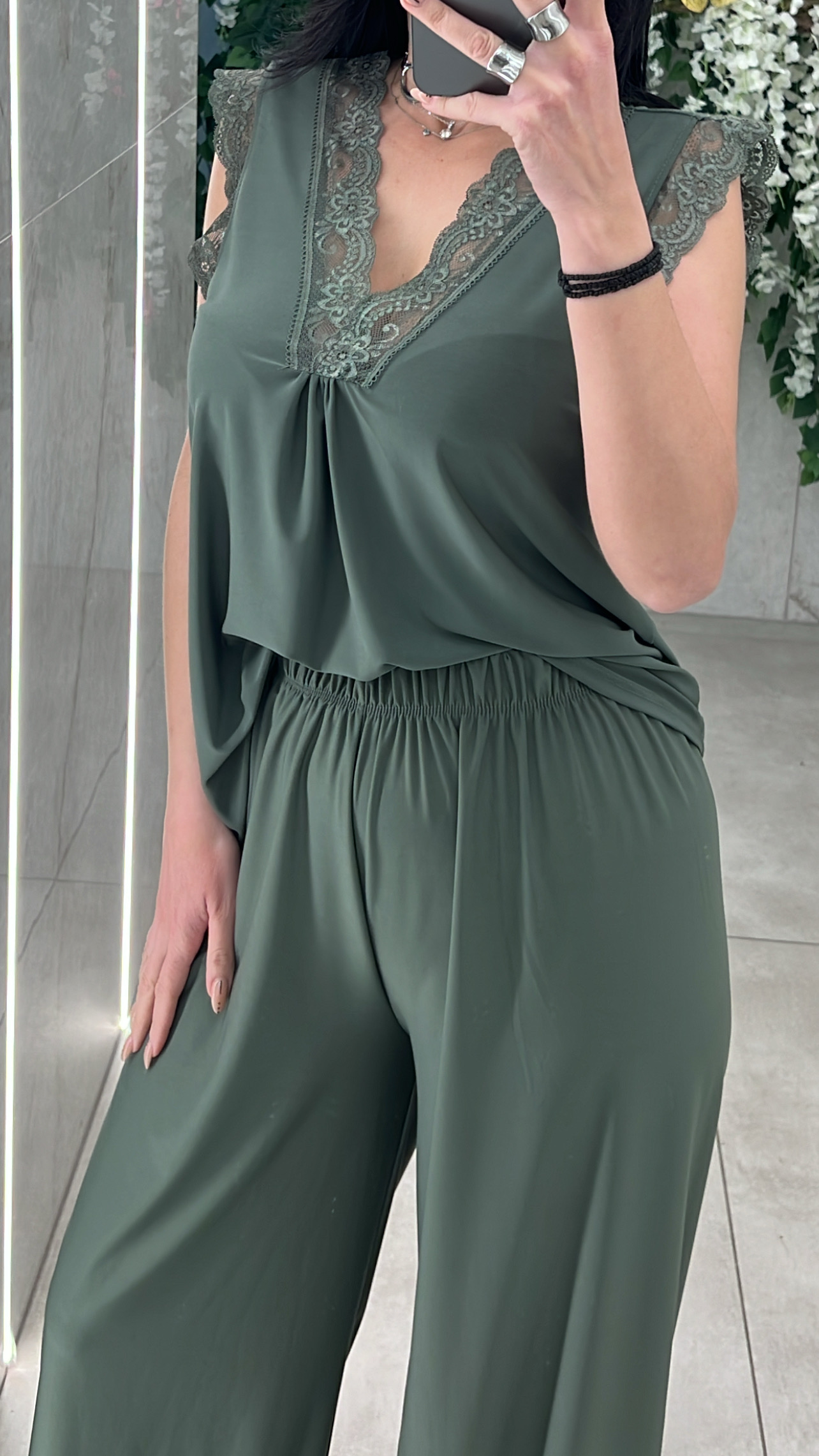 Σετ casual αποτελειται απο μπλουζα αμάνικη με λεπτομέρειες δαντελα και παντελόνα με λάστιχο στην μέση .
