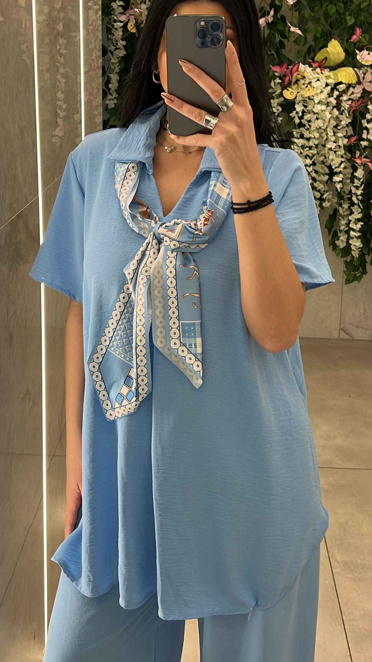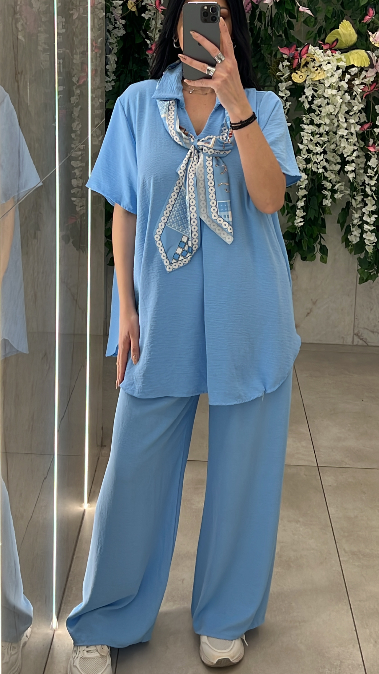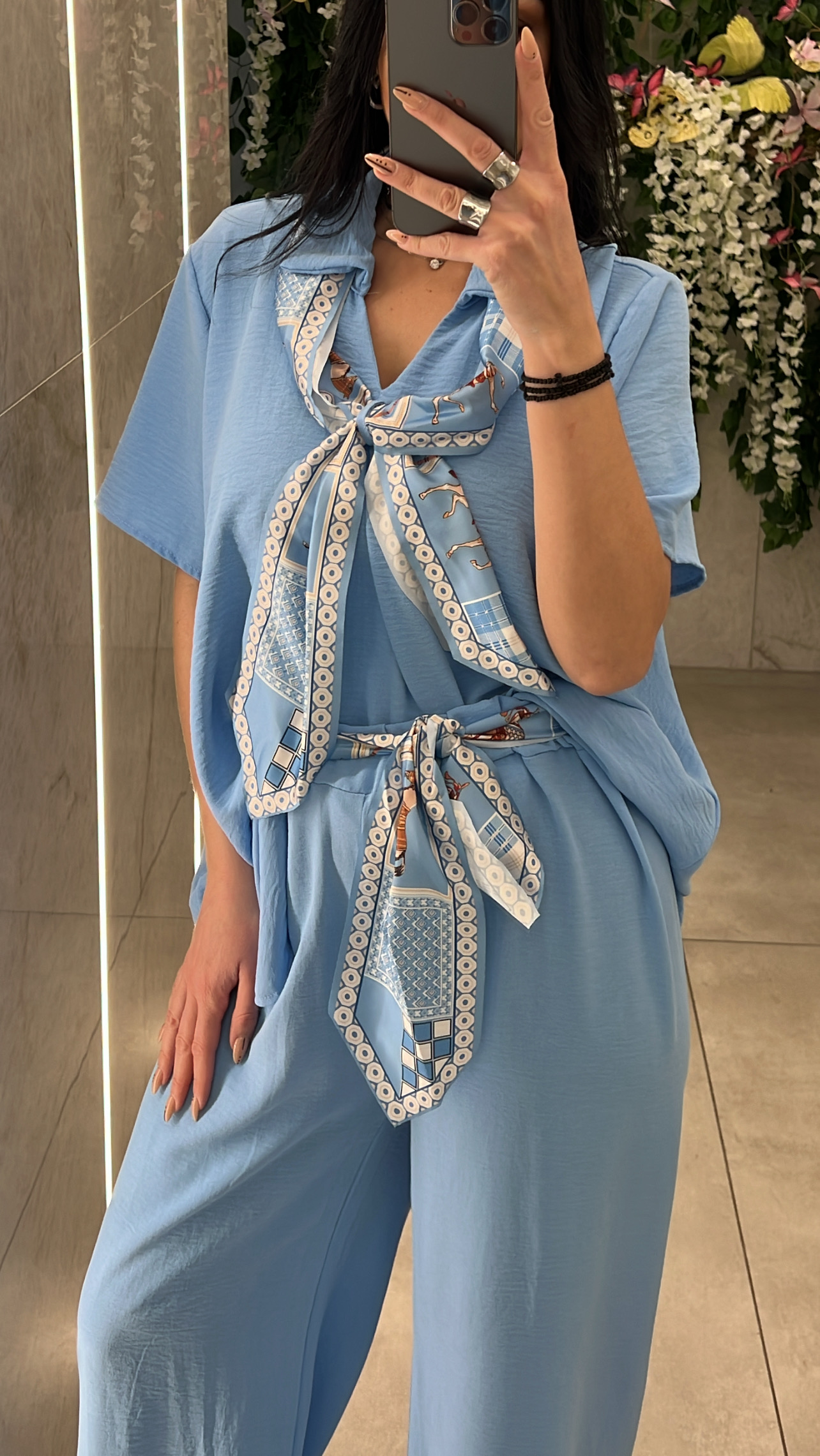 Σετ casual διαθέτει 2 σατεν μαντιλια για τον λαιμο και ως ζωνη , μπλουζα κοντομάνικι με γιακά  και παντελόνι με λάστιχο στην μέση .