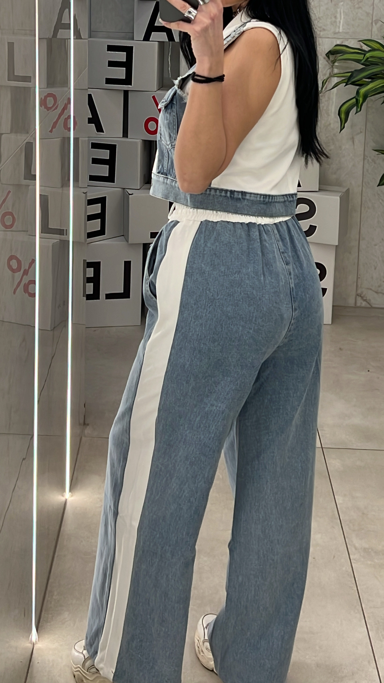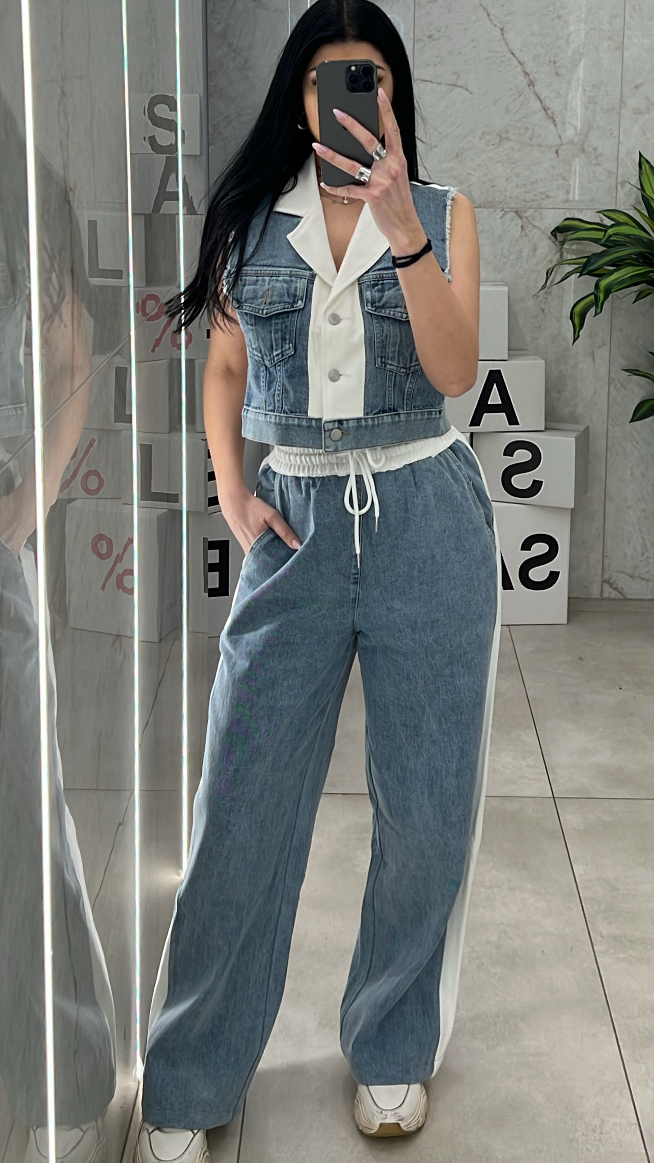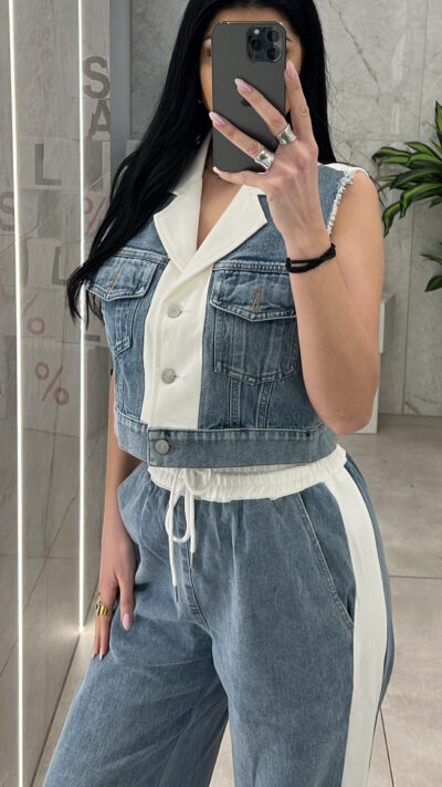 Denim σετ ,παντελόνα ψηλόμεση με λάστιχο στην μεση , κορδόνι και ριγα στο πλαι .Γιλέκο αμάνικο  με τσέπες και κουμπιά ,μπροστά είναι denim και πισω ύφασμα .