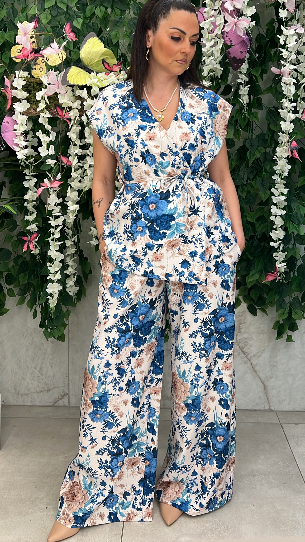 Σετ φλοράλ ,αποτελειται απο γιλέκο που διαθετει κουμπι και κορδόνι και παντελόνα με λαστιχο στην μέση ,δικη του ζώνη και τσέπες.