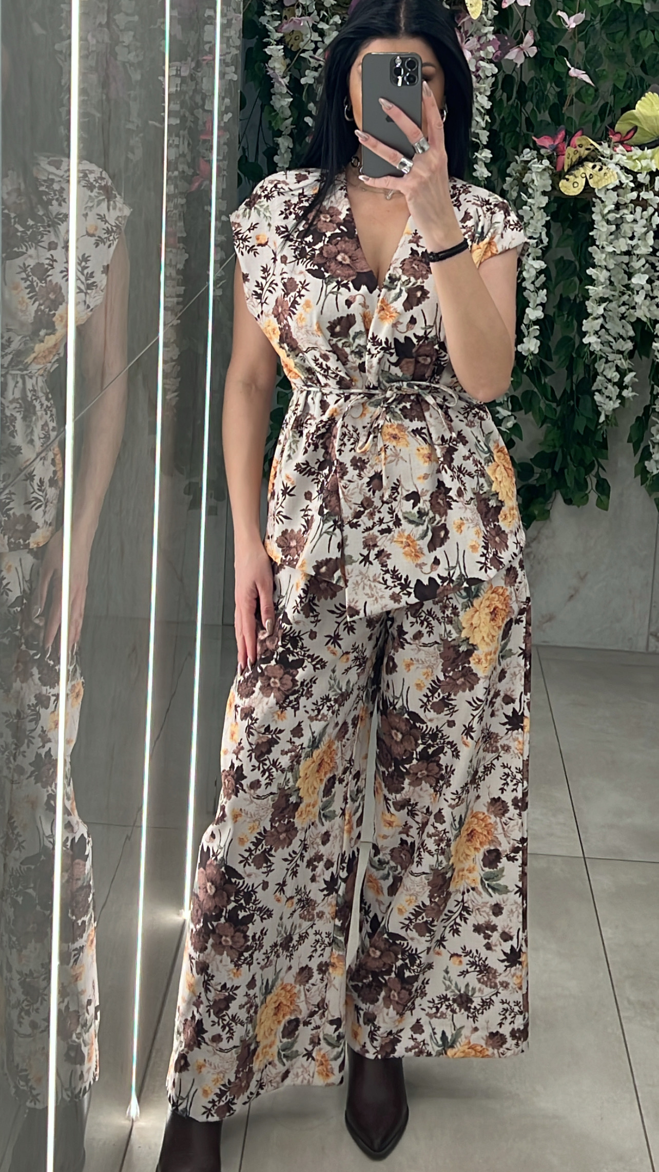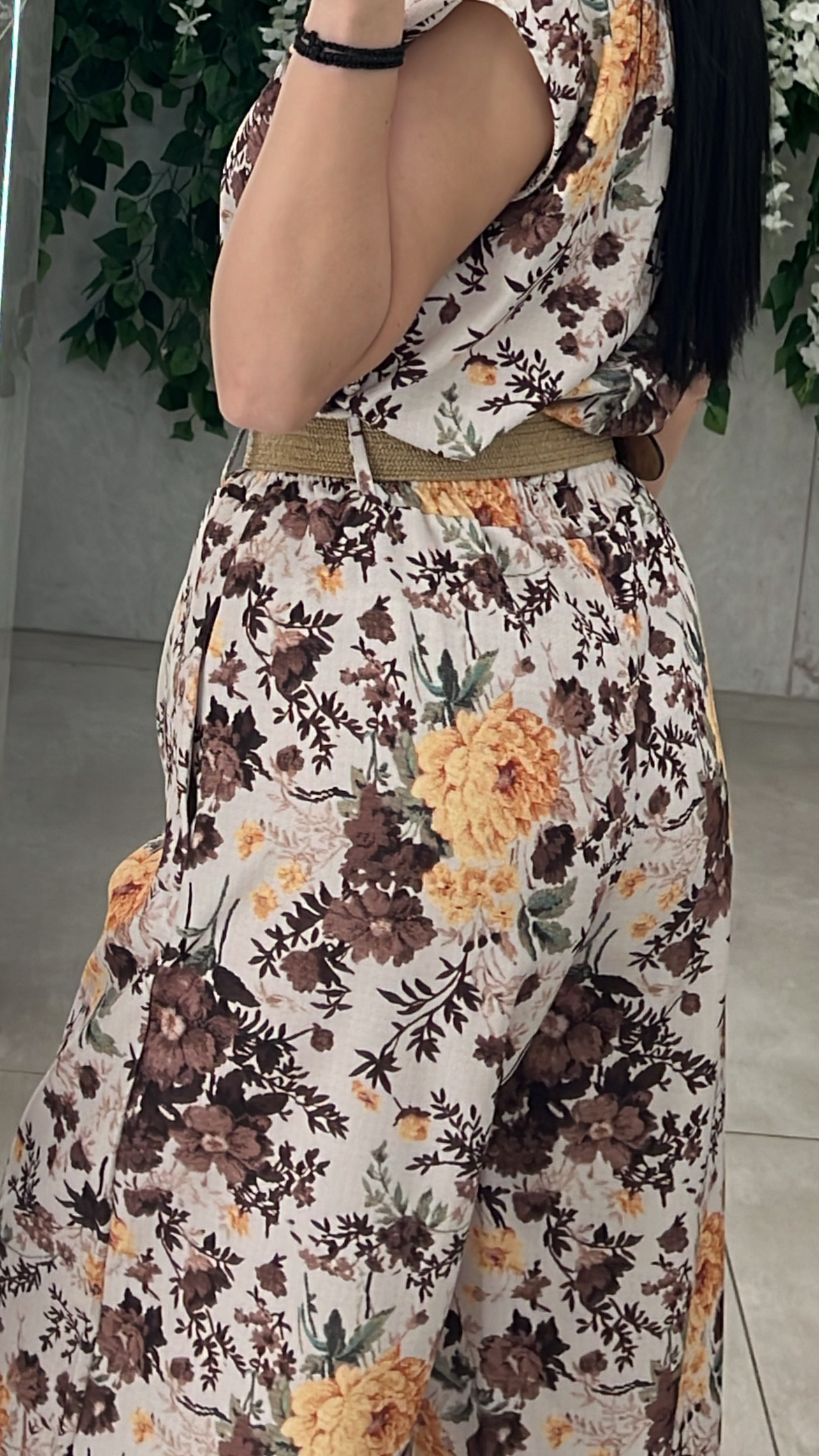 Σετ φλοράλ ,αποτελειται απο γιλέκο που διαθετει κουμπι και κορδόνι και παντελόνα με λαστιχο στην μέση ,δικη του ζώνη και τσέπες.