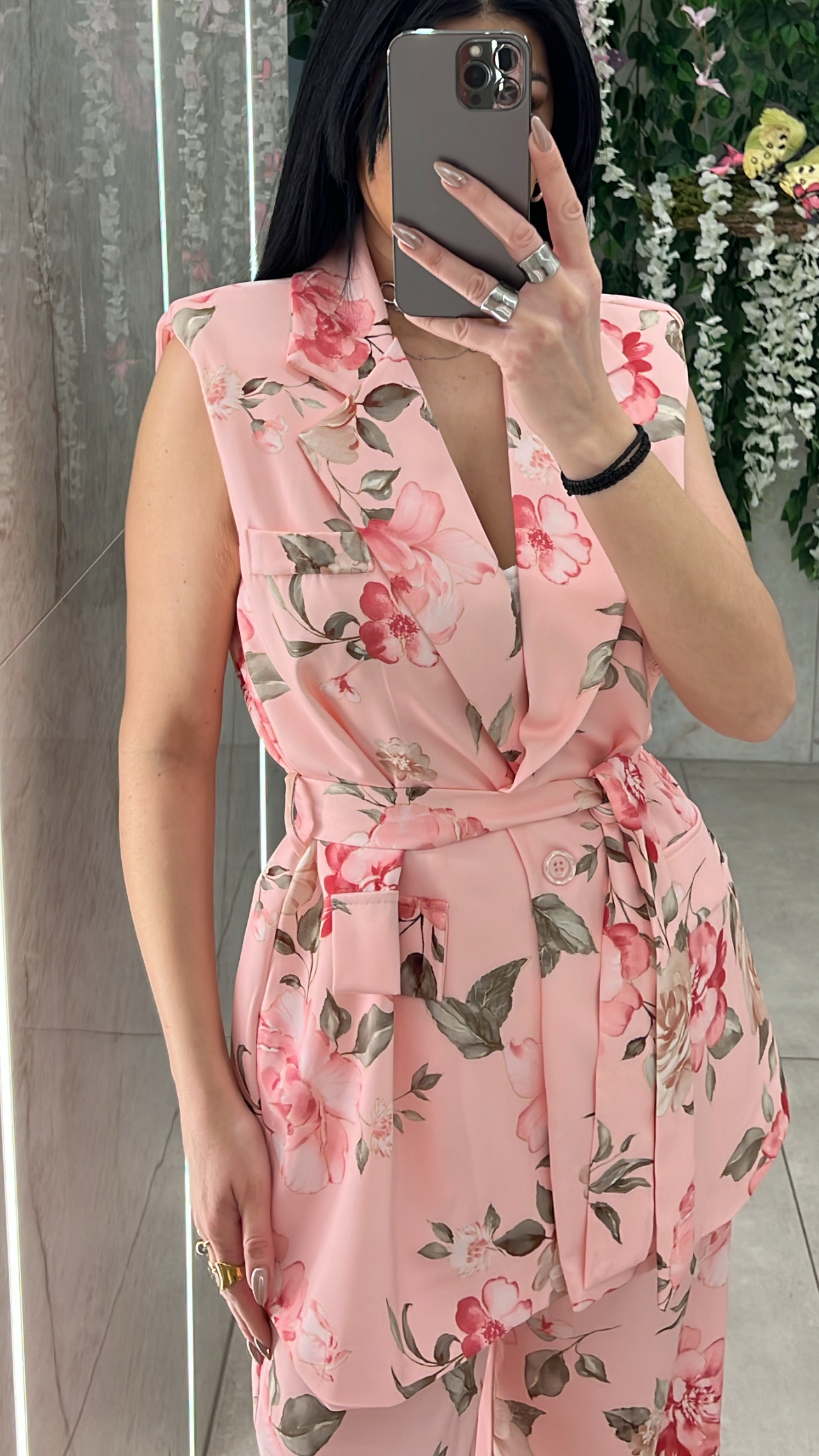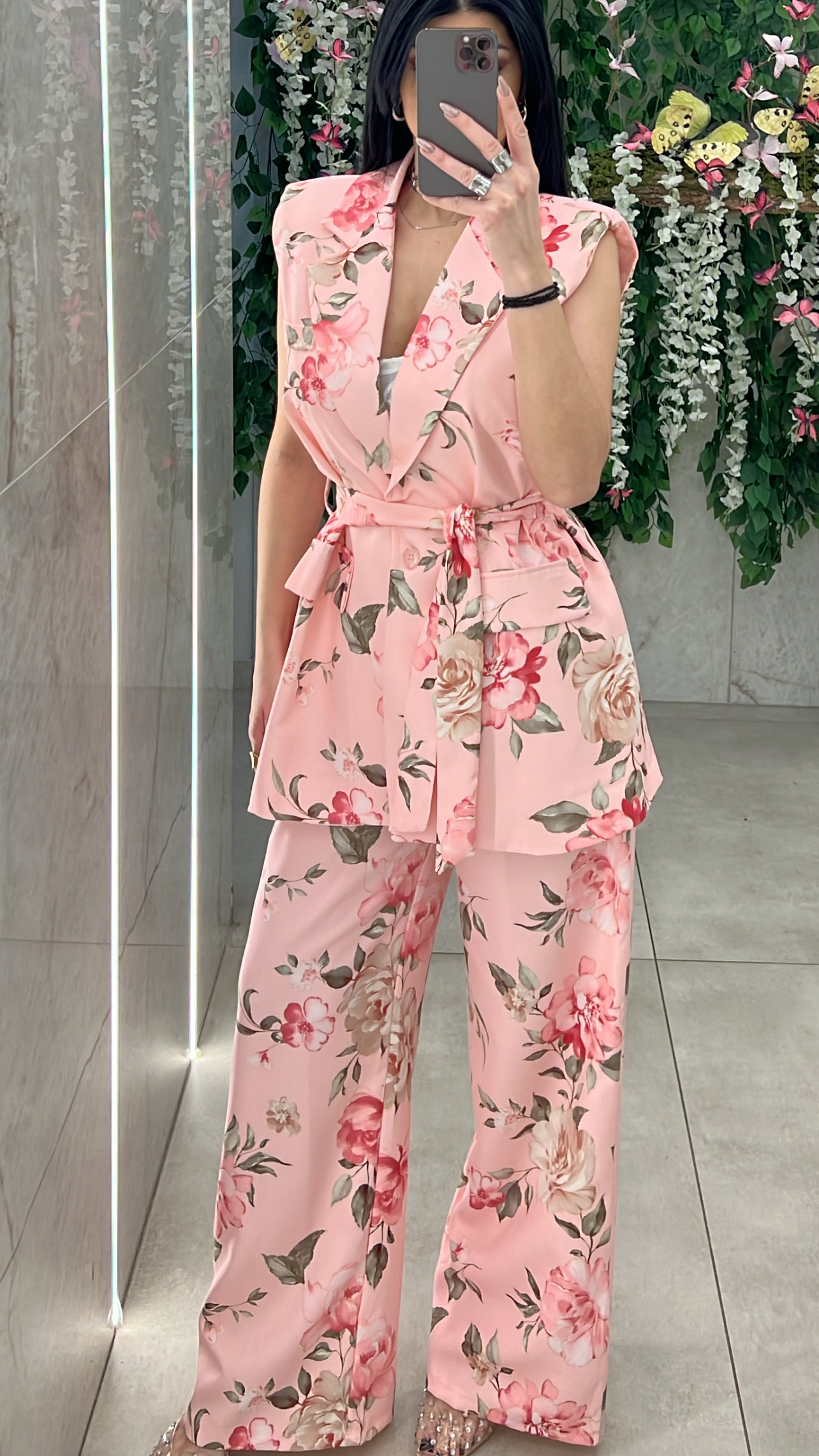 Σετ φλοραλ αποτελειται απο αμάνικο γιλεκο με διακοσμητικες τσέπες ,δικη του ζώνη και εσωτερικη φόδρα και παντελόνα με λάστιχο στην μέση και τσέπες .