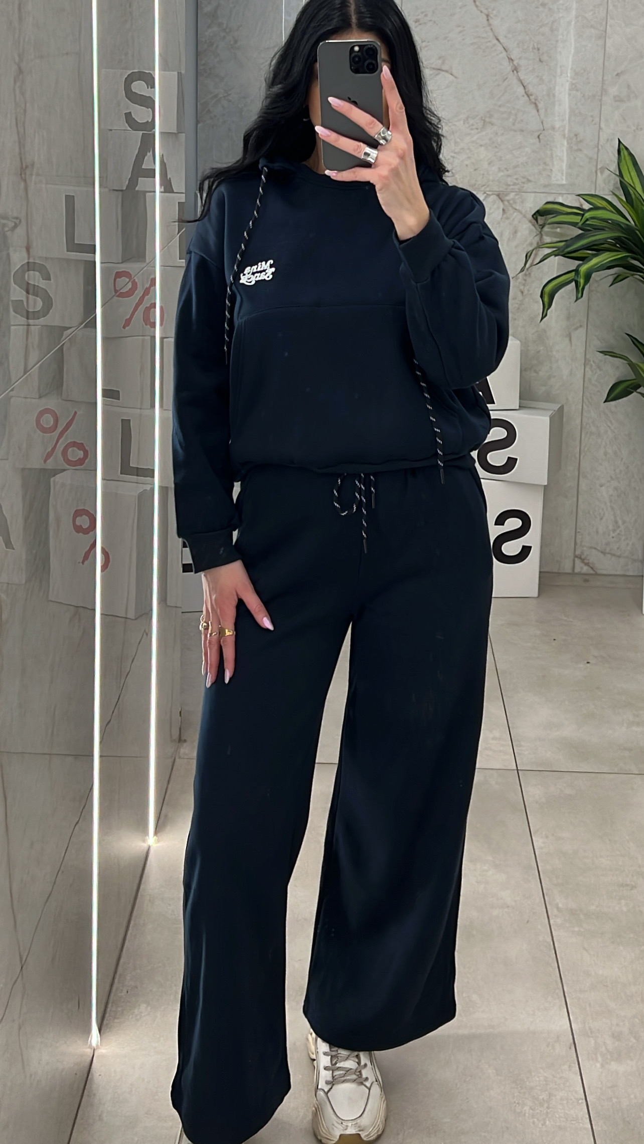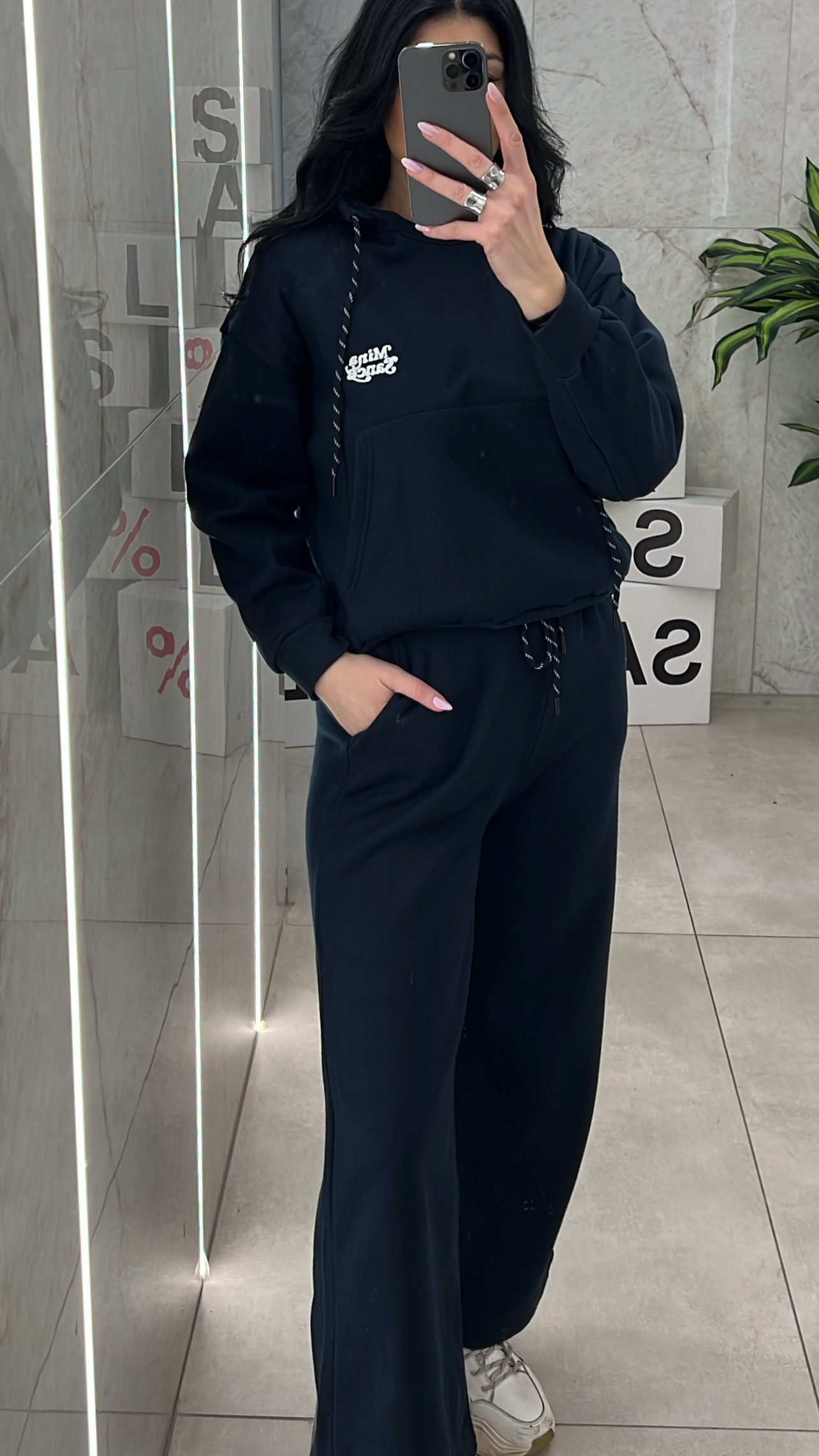Σετ φόρμα με εσωτερική επένδυση , μπλούζα με τσέπες ,κουκούλα και κορδόνι και παντελόνι με λάστιχο ,κορδόνι και τσέπες .
