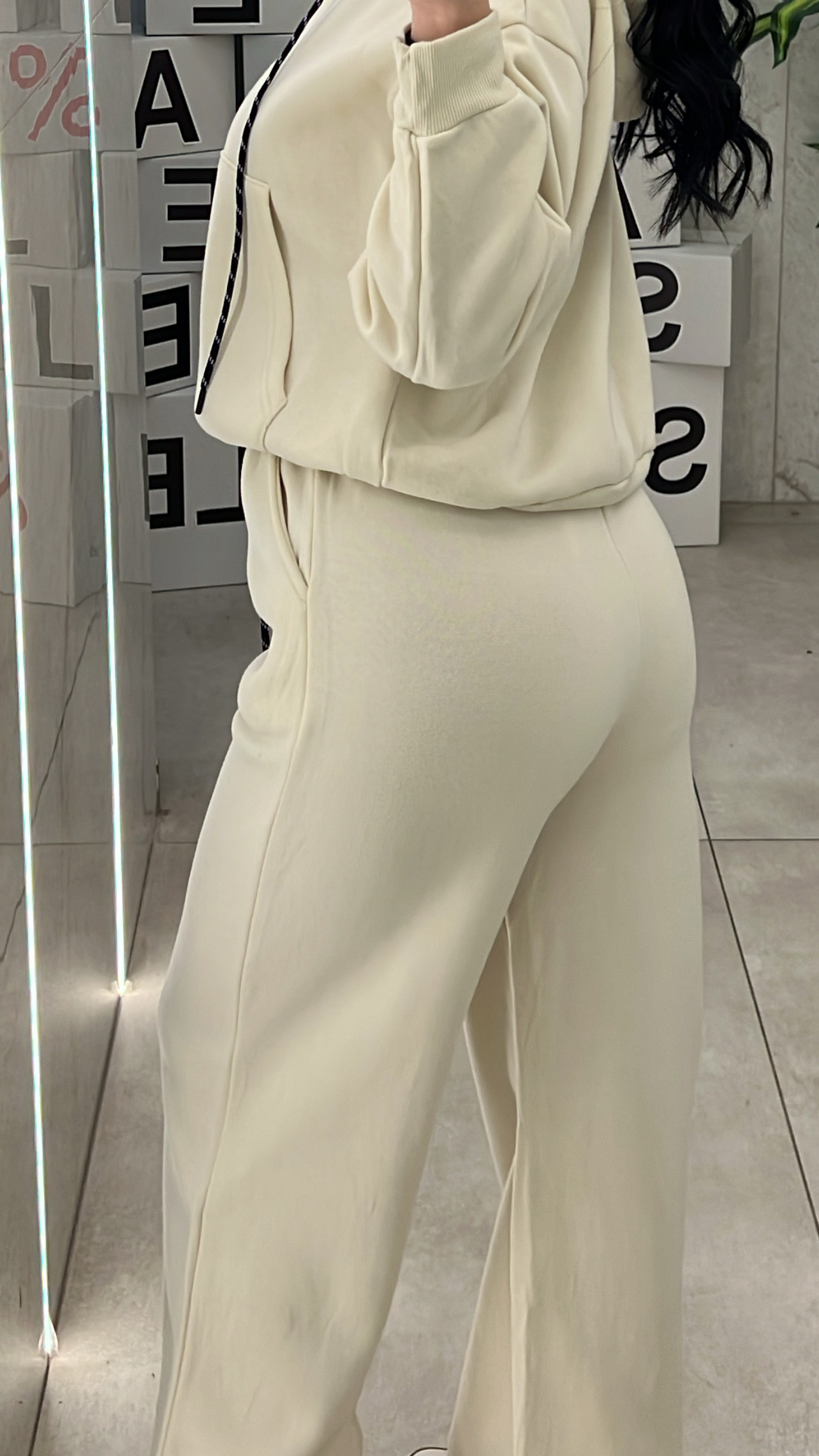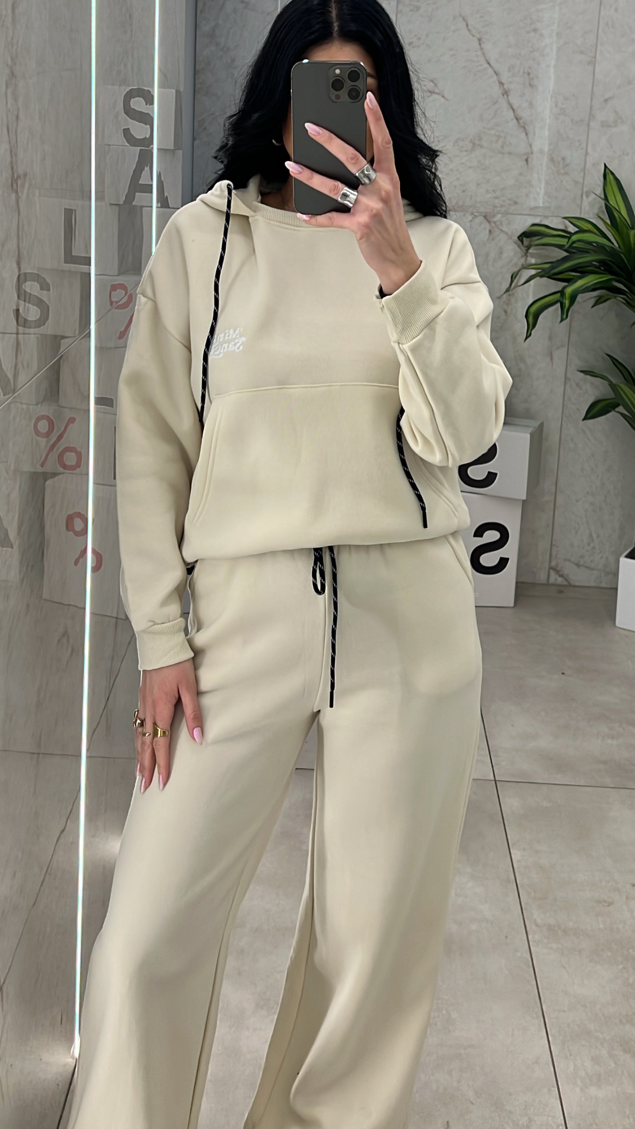 Σετ φόρμα με εσωτερική επένδυση , μπλούζα με τσέπες ,κουκούλα και κορδόνι και παντελόνι με λάστιχο ,κορδόνι και τσέπες .
