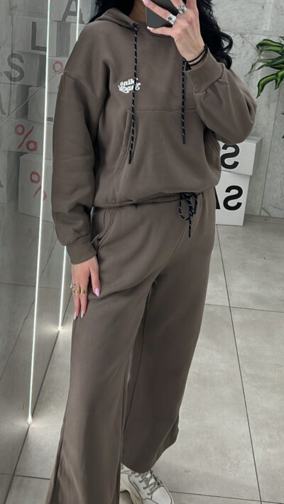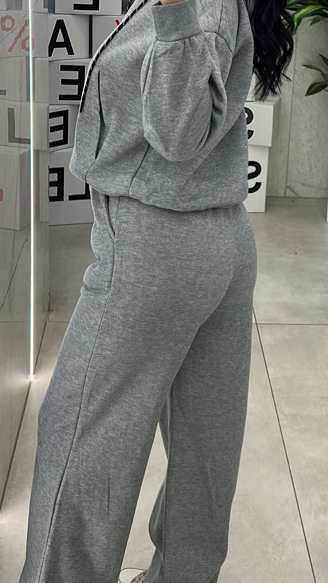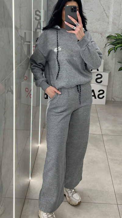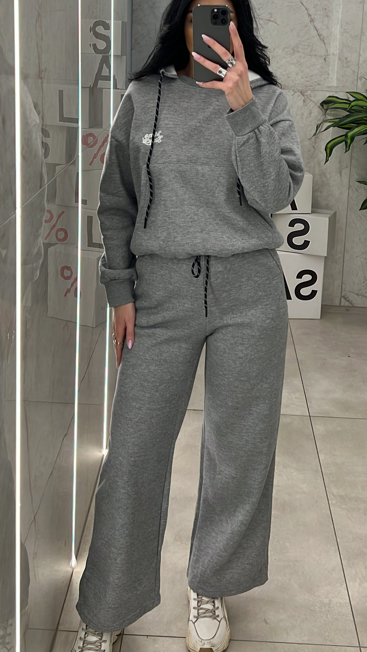 Σετ φόρμα με εσωτερική επένδυση , μπλούζα με τσέπες ,κουκούλα και κορδόνι και παντελόνι με λάστιχο ,κορδόνι και τσέπες .