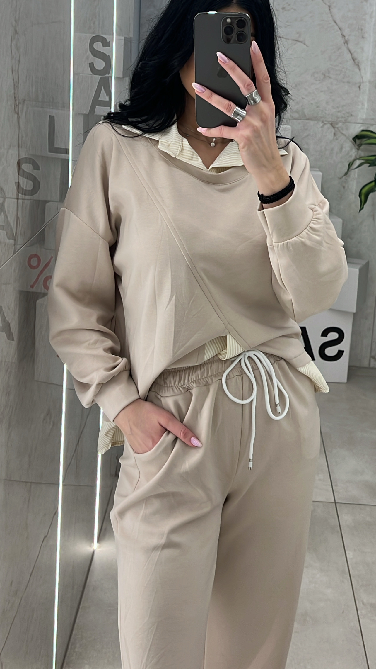 Σετ φόρμα , μπλούζα με ενσωματομένο πουκάμισο ριγέ ,παντελόνα με λάστιχο ,κορδόνι και τσέπες.