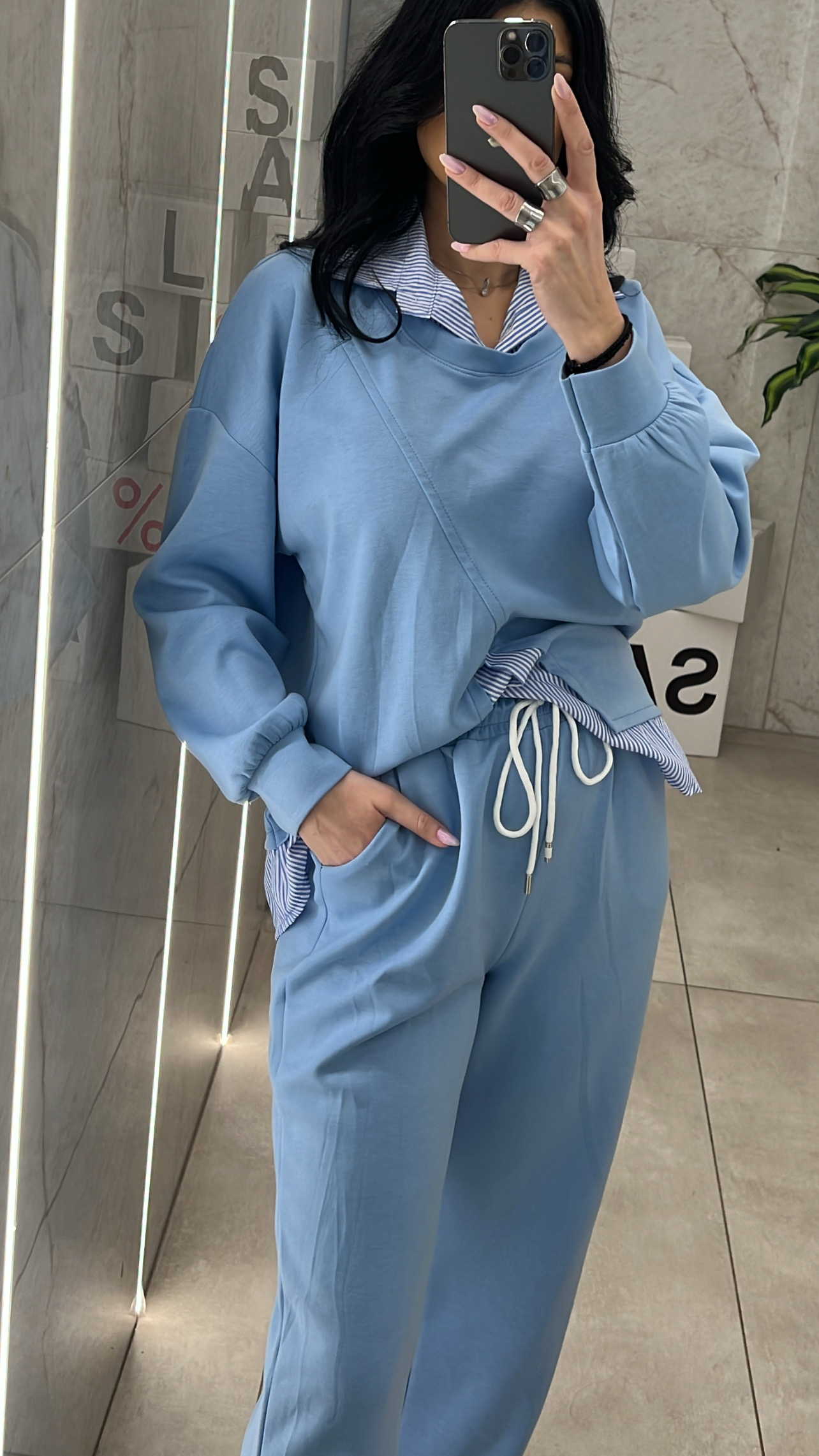 Σετ φόρμα , μπλούζα με ενσωματομένο πουκάμισο ριγέ ,παντελόνα με λάστιχο ,κορδόνι και τσέπες.