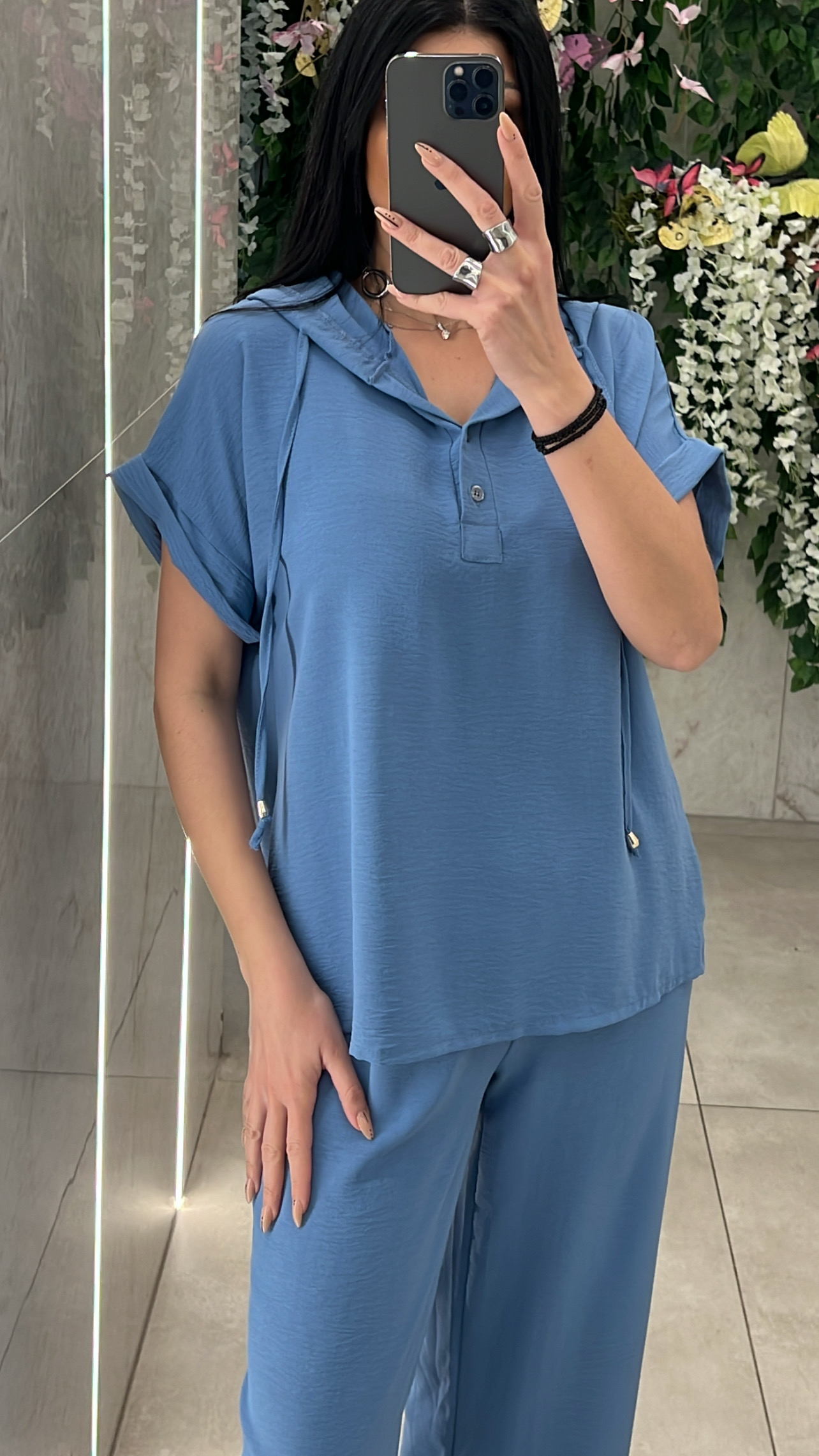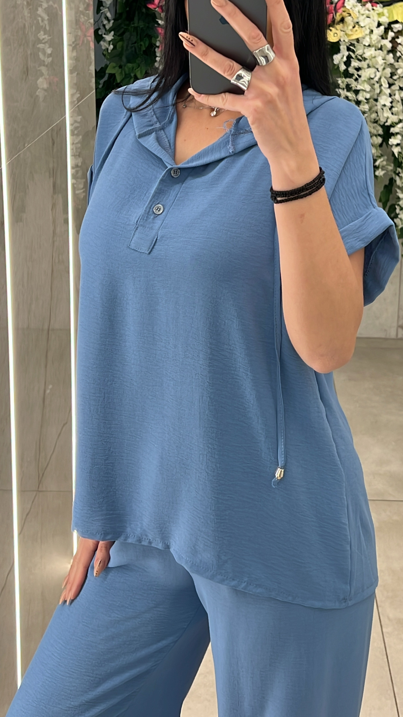 Σετ φόρμας , πουκαμισα με κουκουλα και κορδόνι και παντελόνα με λάστιχο στην μέση .