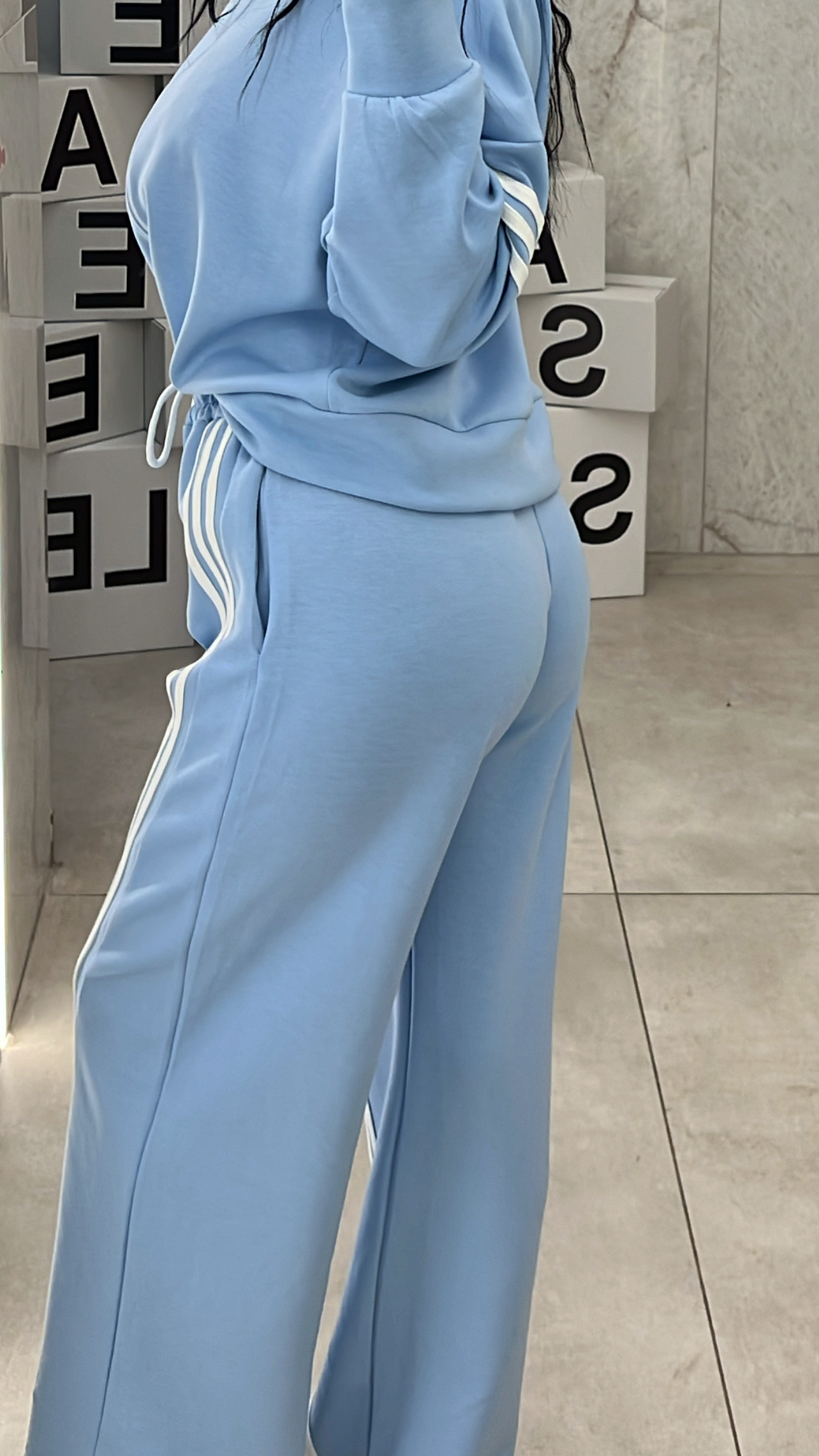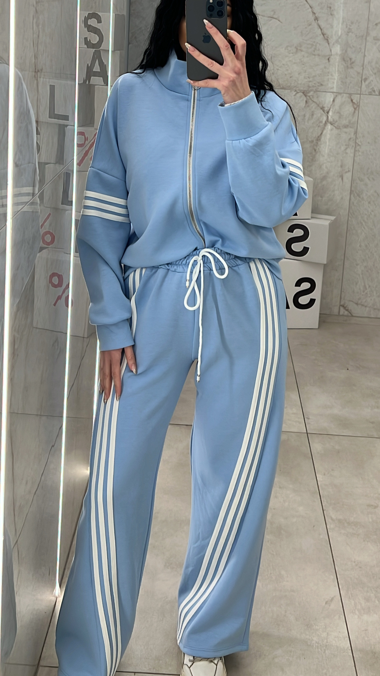 Σετ φόρμας με ρίγες , η ζακέτα κλείνει με φερμουάρ και η παντελόνα έχει λαστίχο , κορδόνι και τσέπες .
