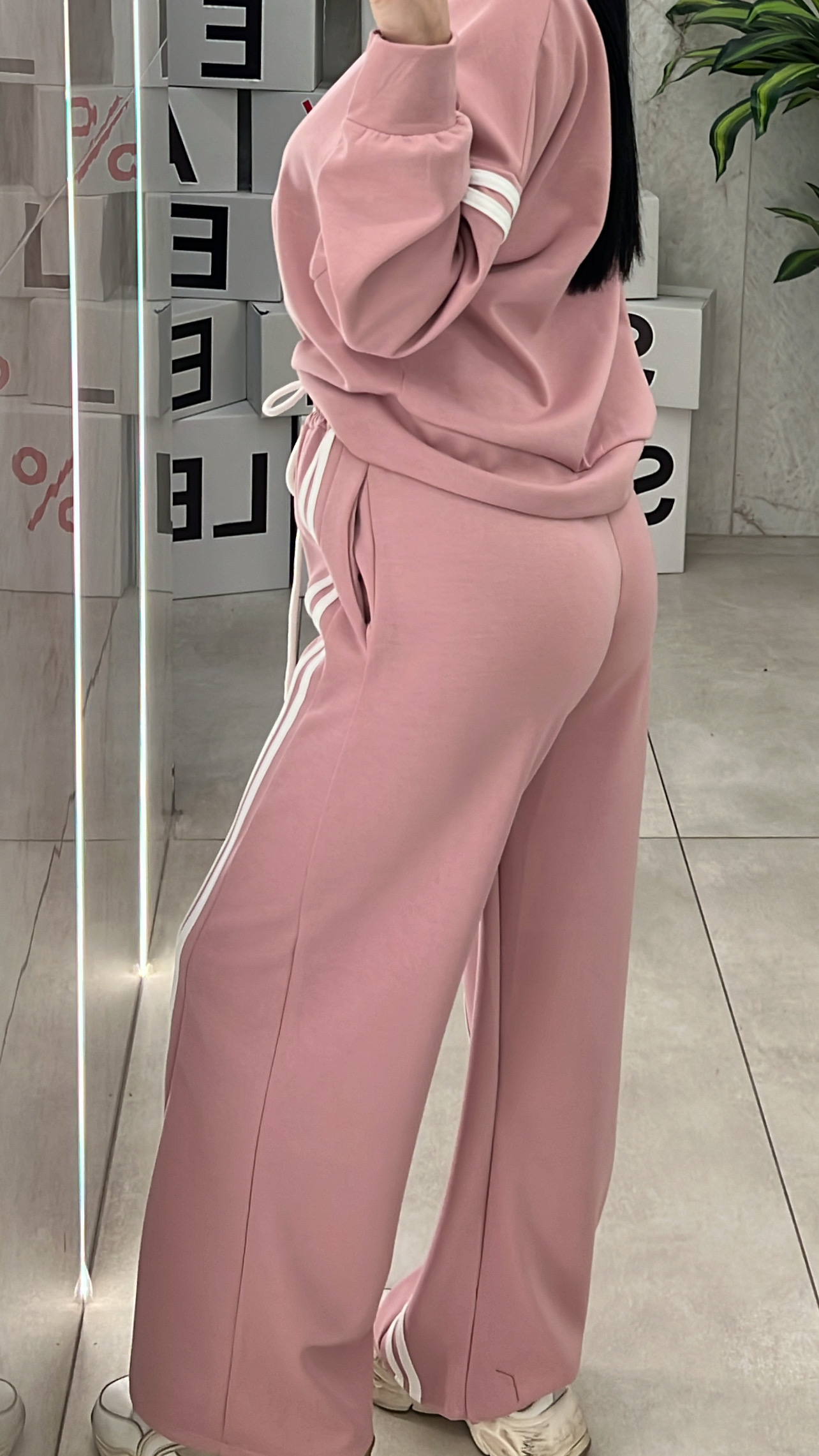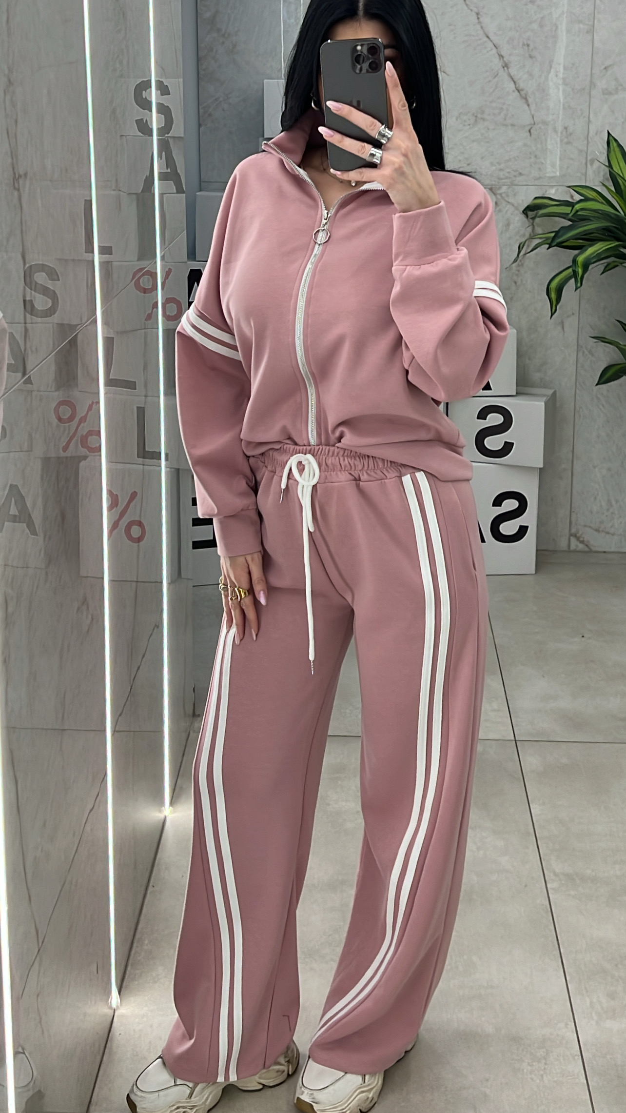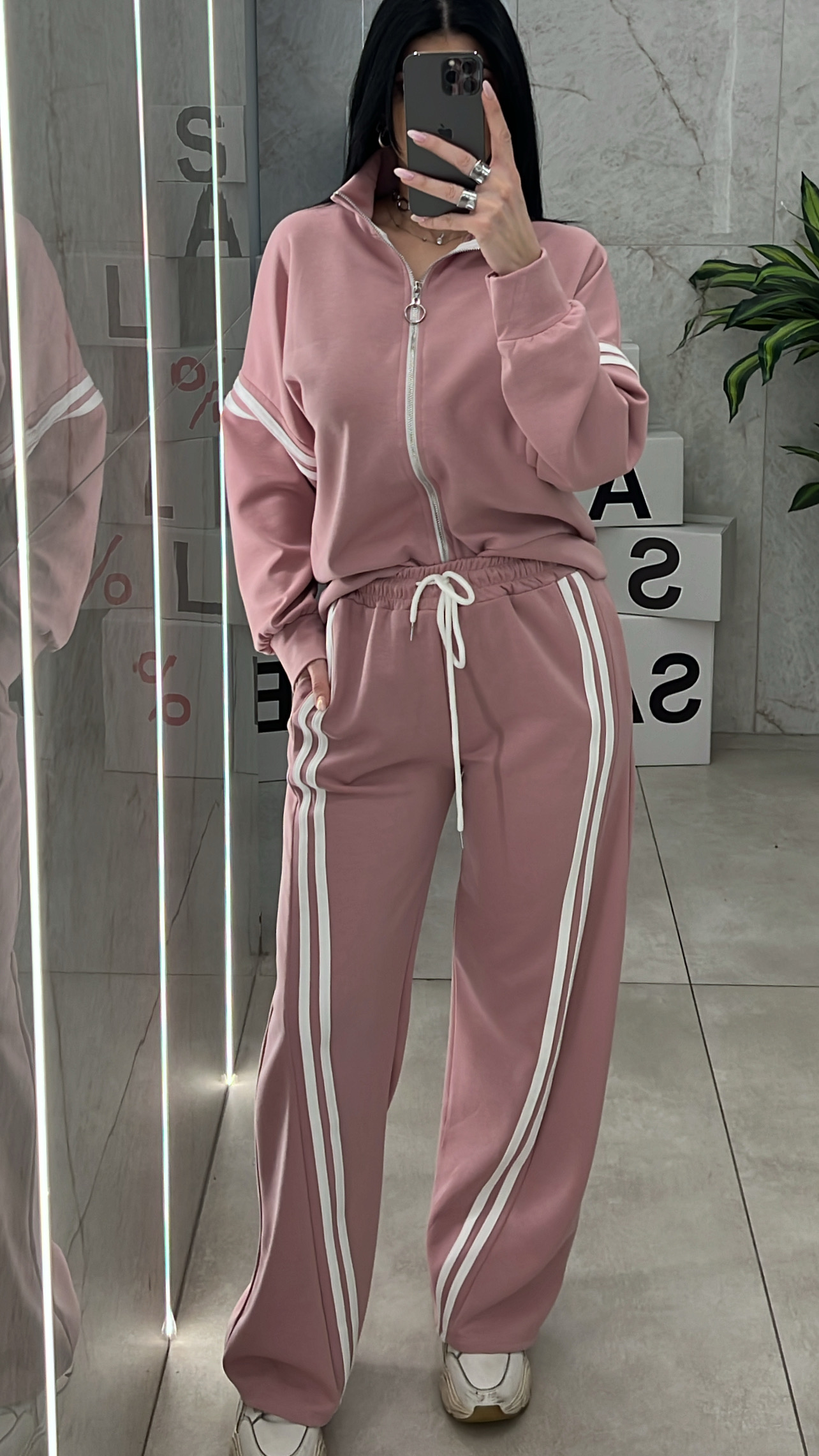 Σετ φόρμας με ρίγες , η ζακέτα κλείνει με φερμουάρ και η παντελόνα έχει λαστίχο , κορδόνι και τσέπες .