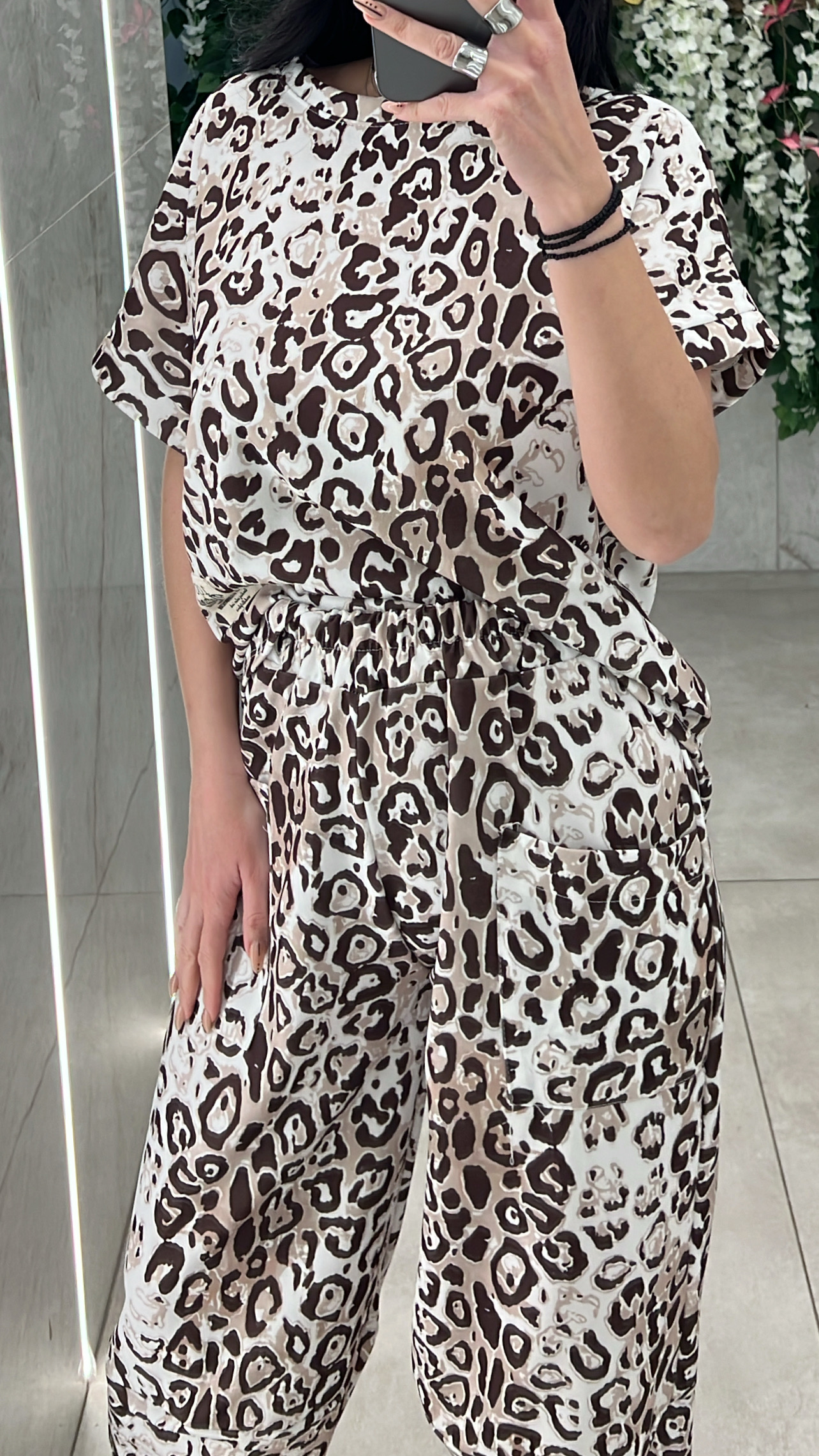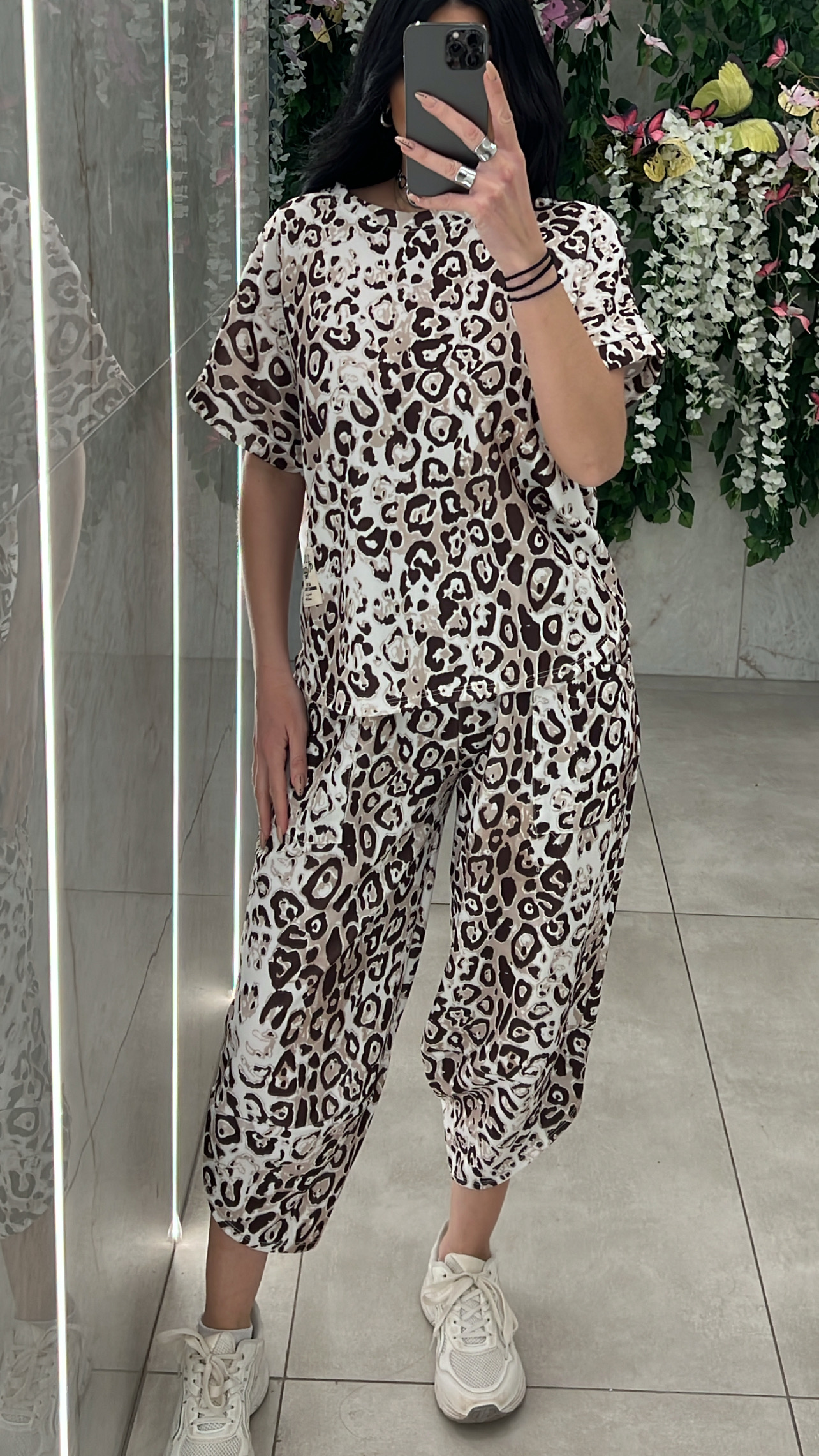 Σετ φορμας , μπλουζα κοντομάνικι  και παντελόνι σαλβάρι με λάστιχο και τσέπες στην μέση .