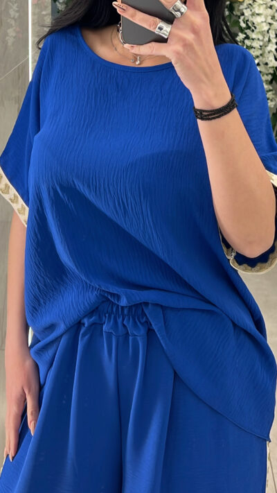 Σετ φόρμας ,μπλούζα με σούρες στο πλαι και παντελονα με λάστιχο στην μέση .