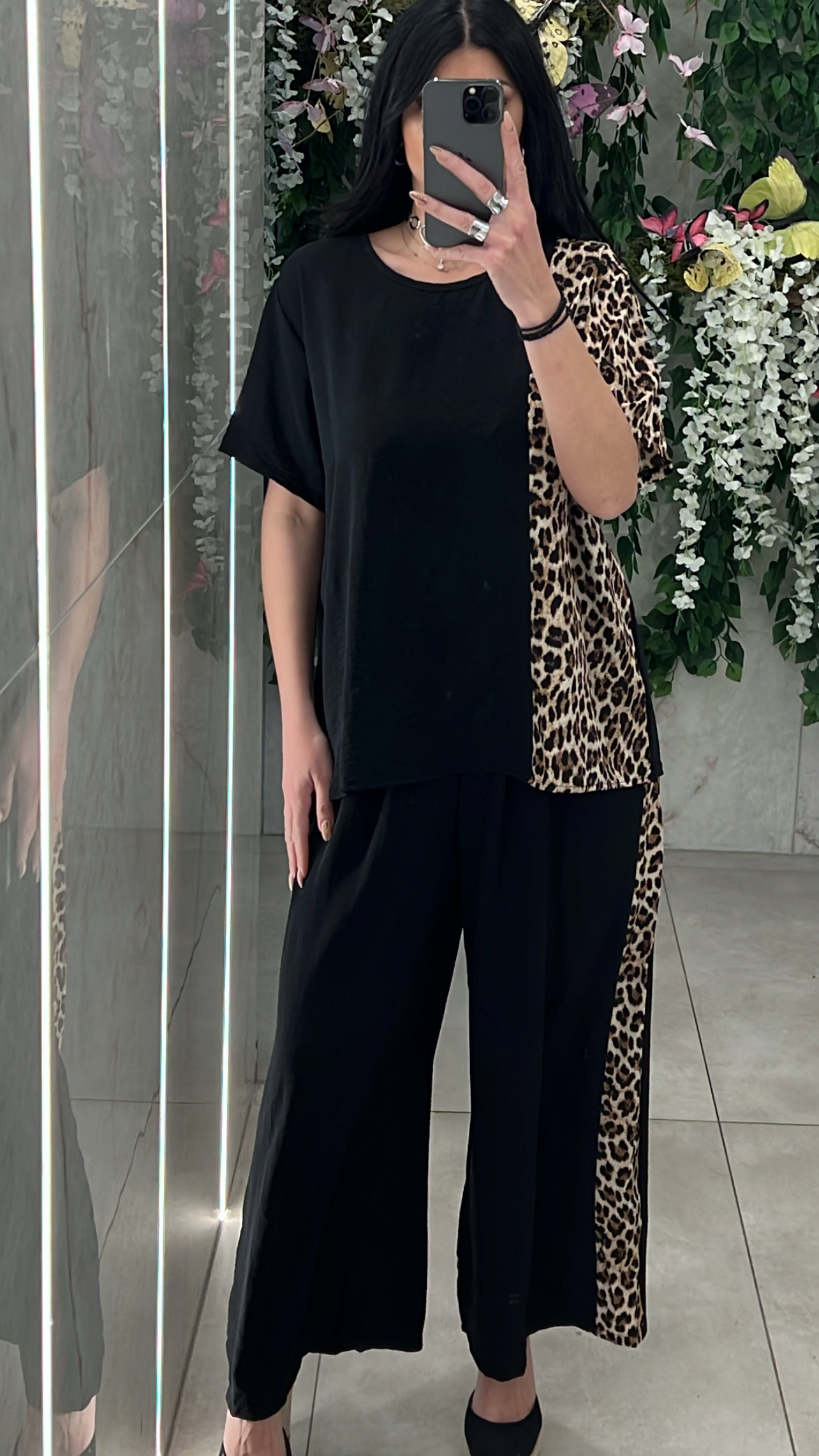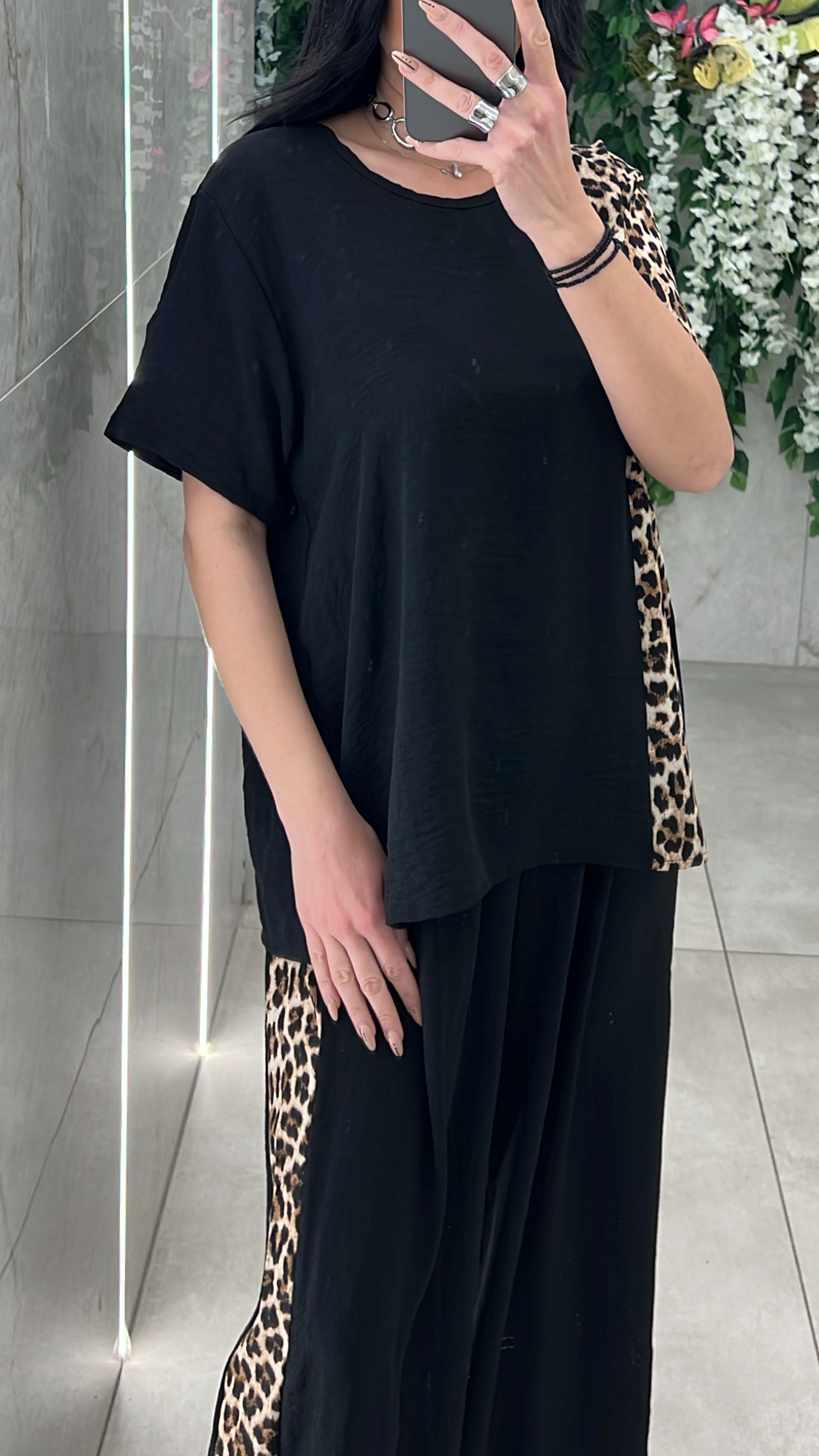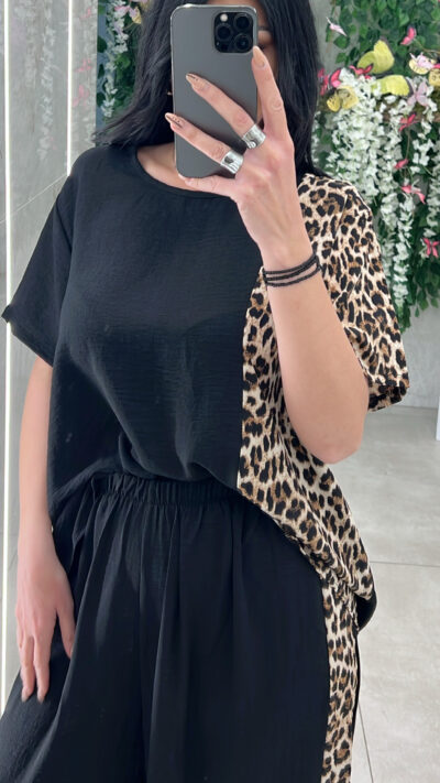 Σετ φορμας με λεπτομέρειες λεοπαρ ,αποτελειται απο μπλουζα κοντομάνικι και παντελονα με λάστιχο στην μέση .