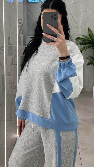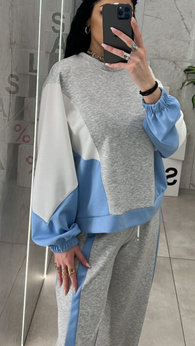 Σετ φόρμας που εχει τριχρωμια ,  μπλουζα και παντελόνι με λάστιχο και κορδόνι στην μέση .