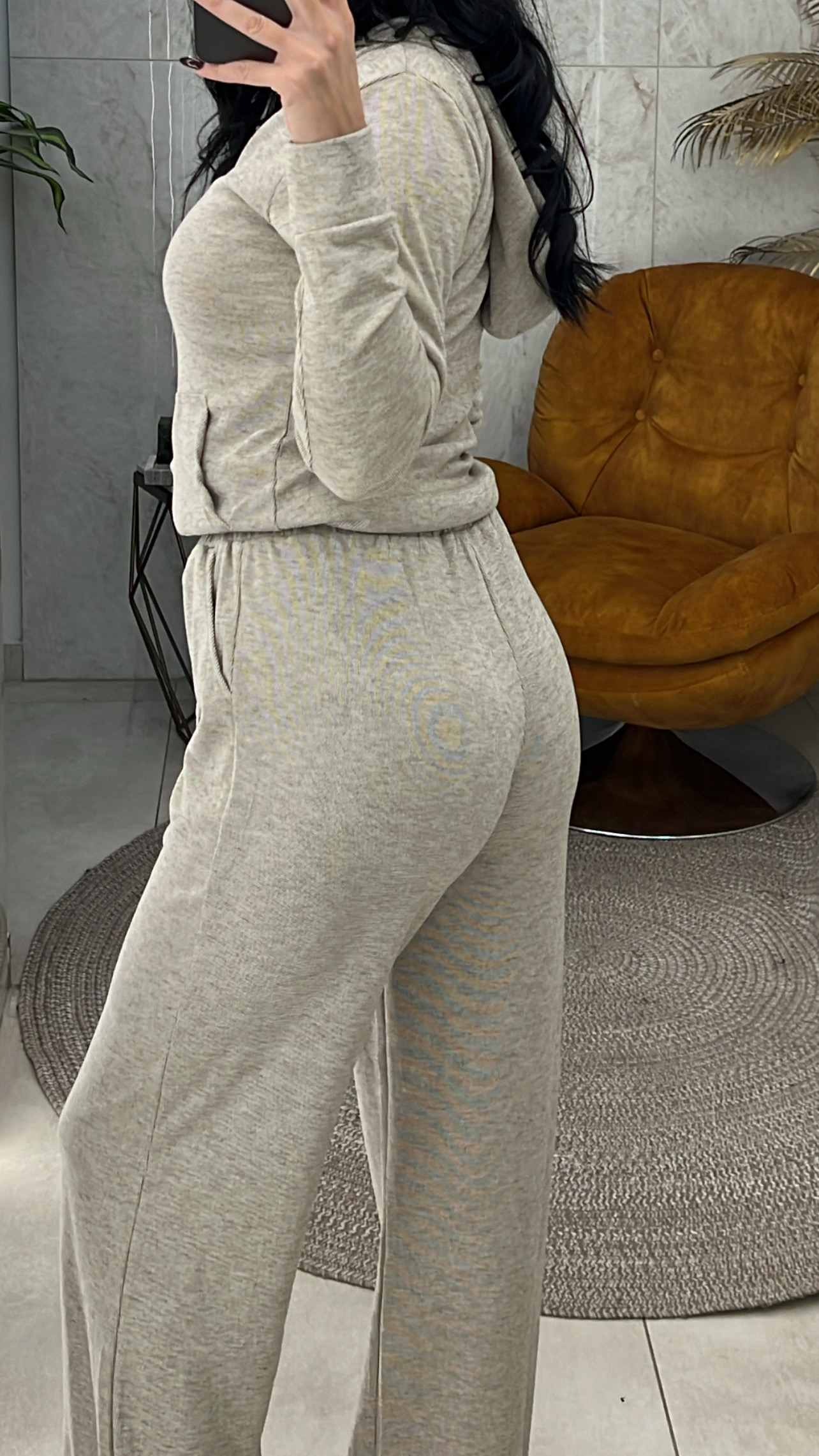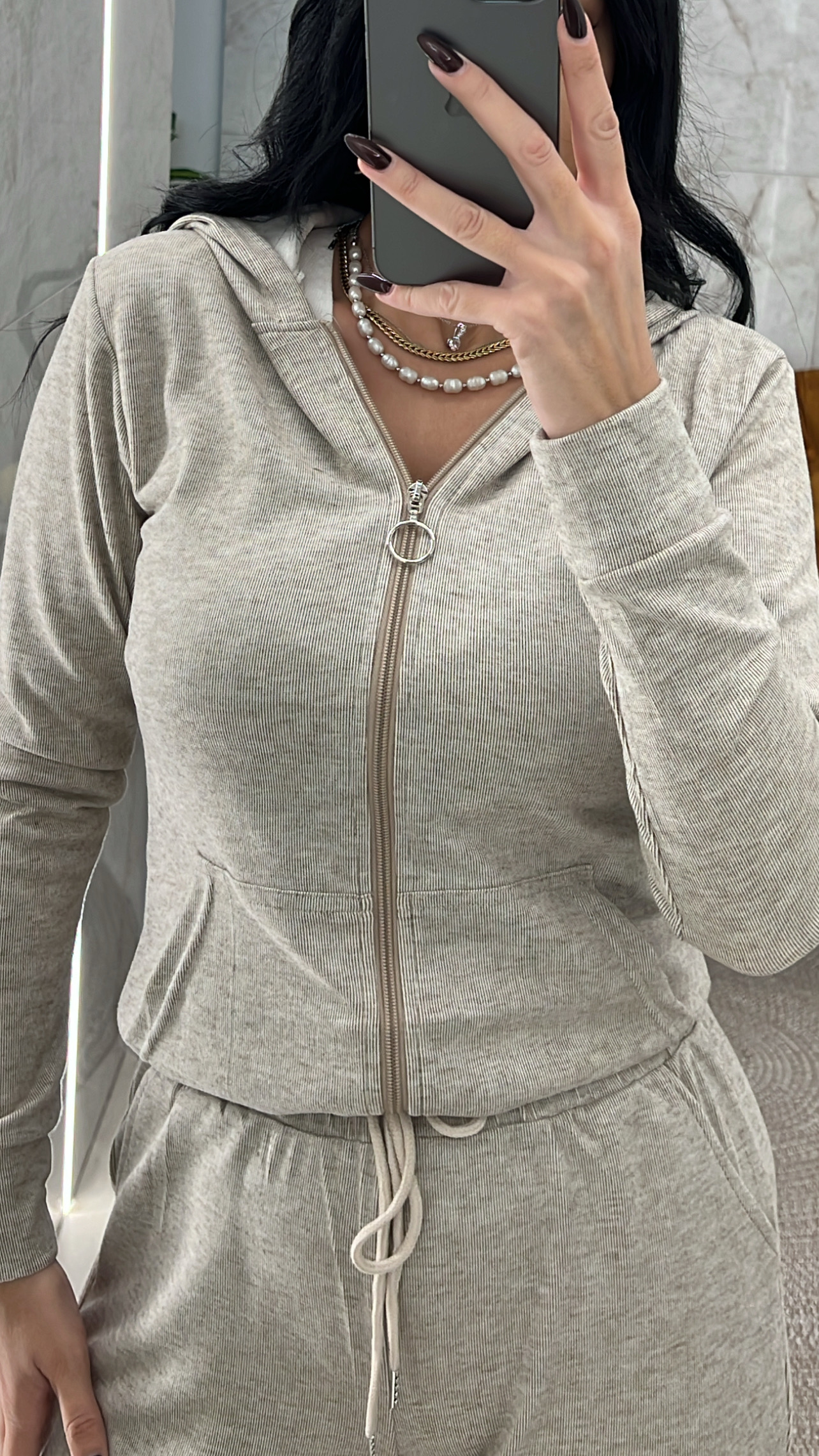 Σετ φόρμας μπεζ ,ζακέτα με κουκούλα φερμουάρ και τσέπες μπροστά , παντελόνι με λάστιχο στη μέση κορδόνι και πλαϊνές τσέπες