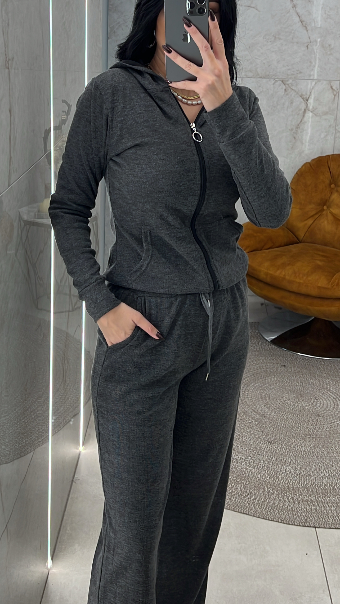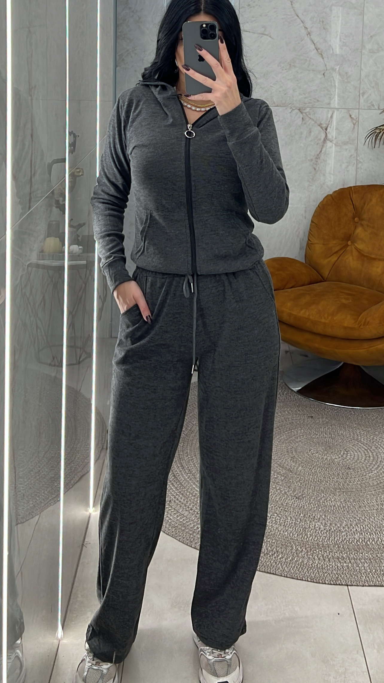 Σετ φόρμας γκρι ,ζακέτα με κουκούλα φερμουάρ και τσέπες μπροστά , παντελόνι με λάστιχο στη μέση κορδόνι και πλαϊνές τσέπες