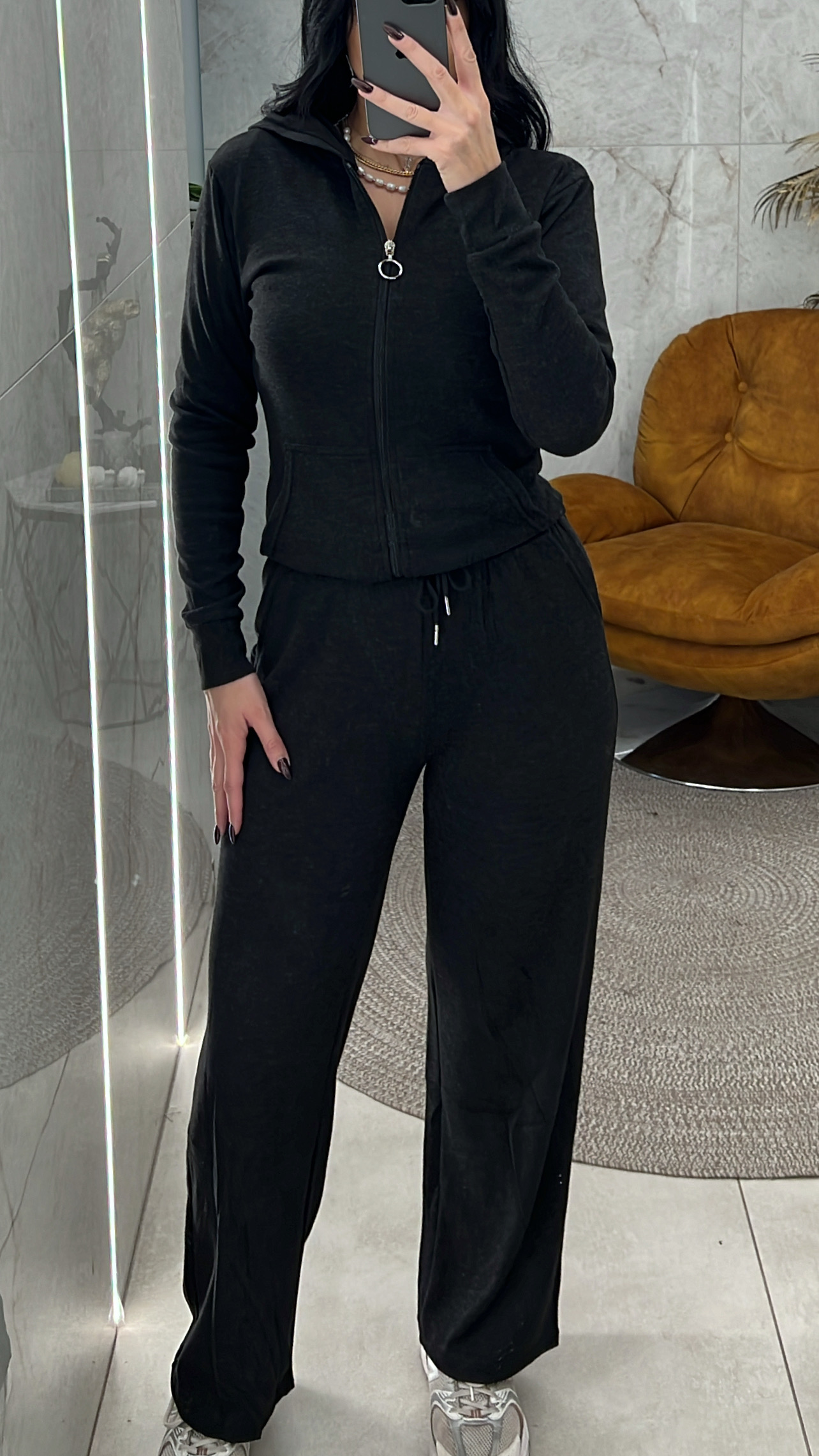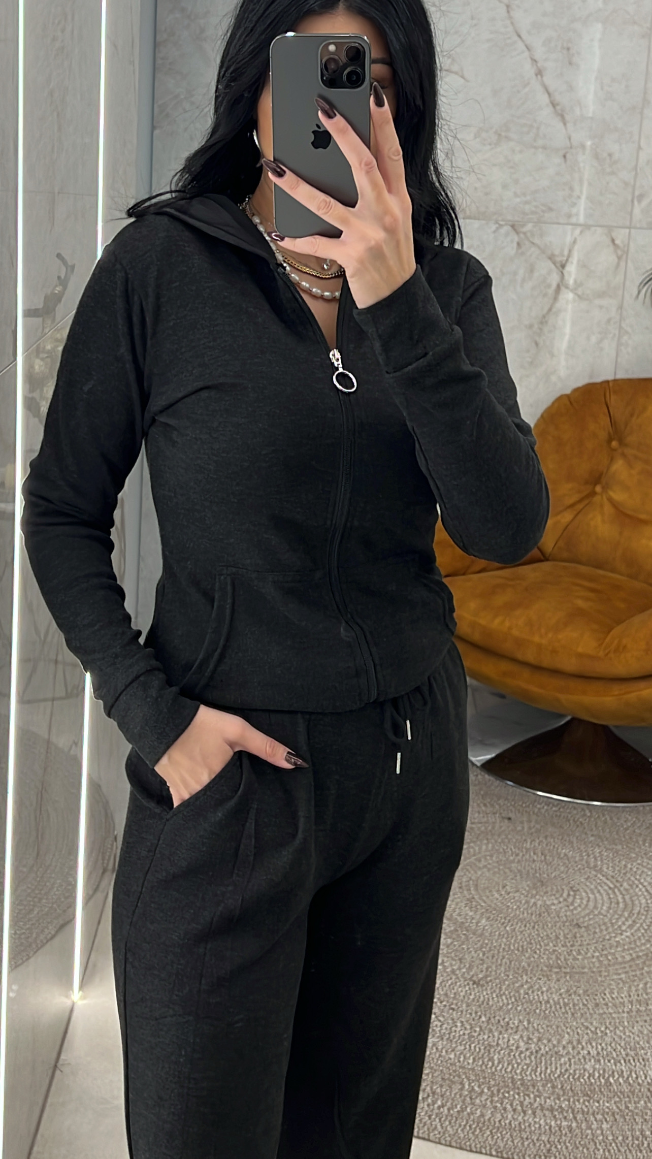 Σετ φόρμας μαύρη ,ζακέτα με κουκούλα φερμουάρ και τσέπες μπροστά , παντελόνι με λάστιχο στη μέση κορδόνι και πλαϊνές τσέπες
