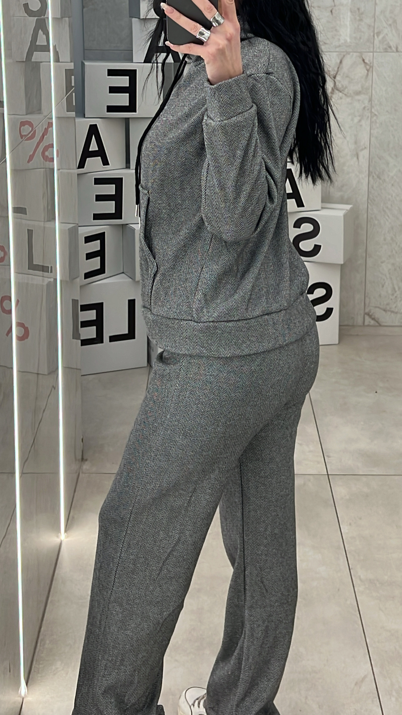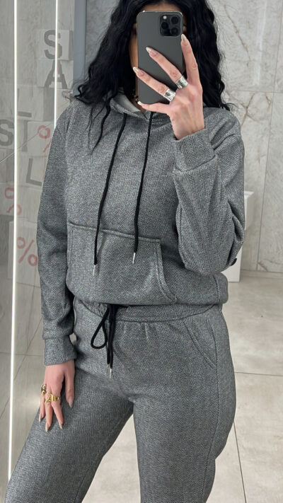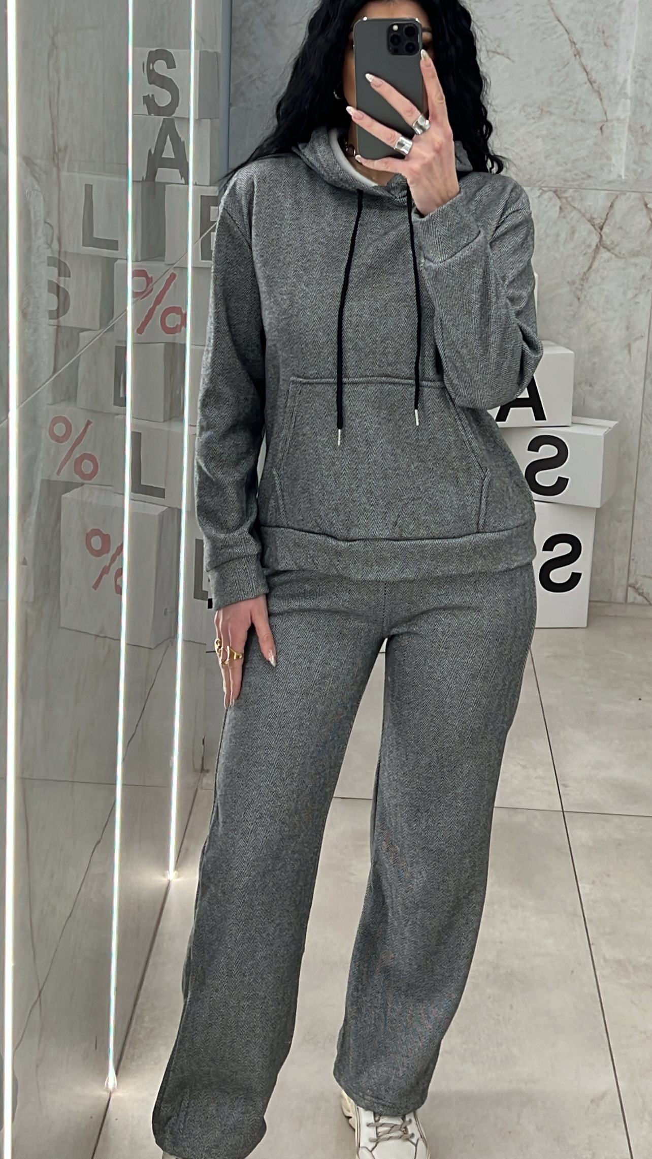 Σετ φόρμας με εσωτερική επένδυση .Η μπλούζα έχει  κουκούλα ,τσέπη και κορδόνι και το παντελόνι είναι ψηλόμεσο με τσέπες και κορδόνι στη μέση .