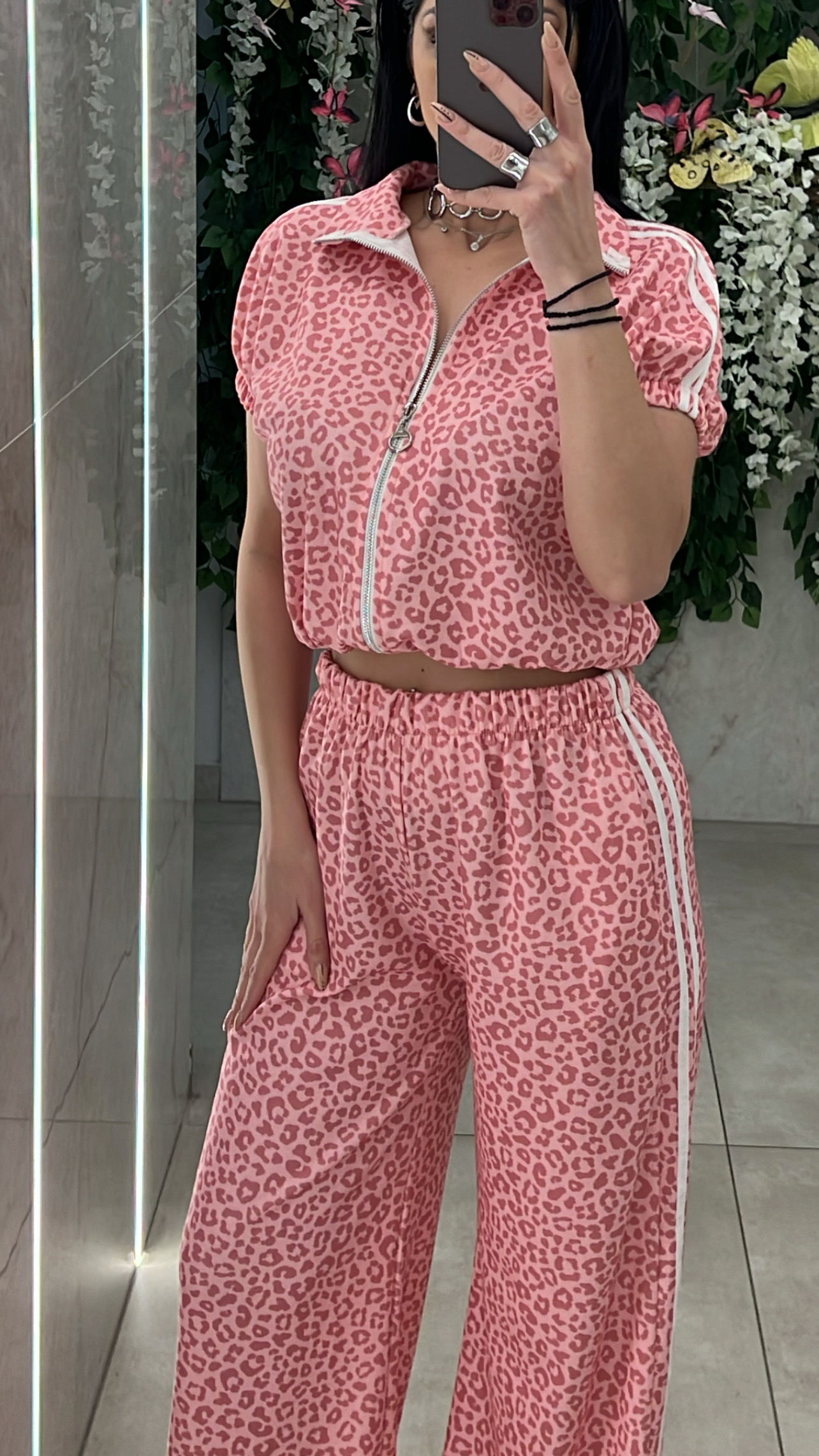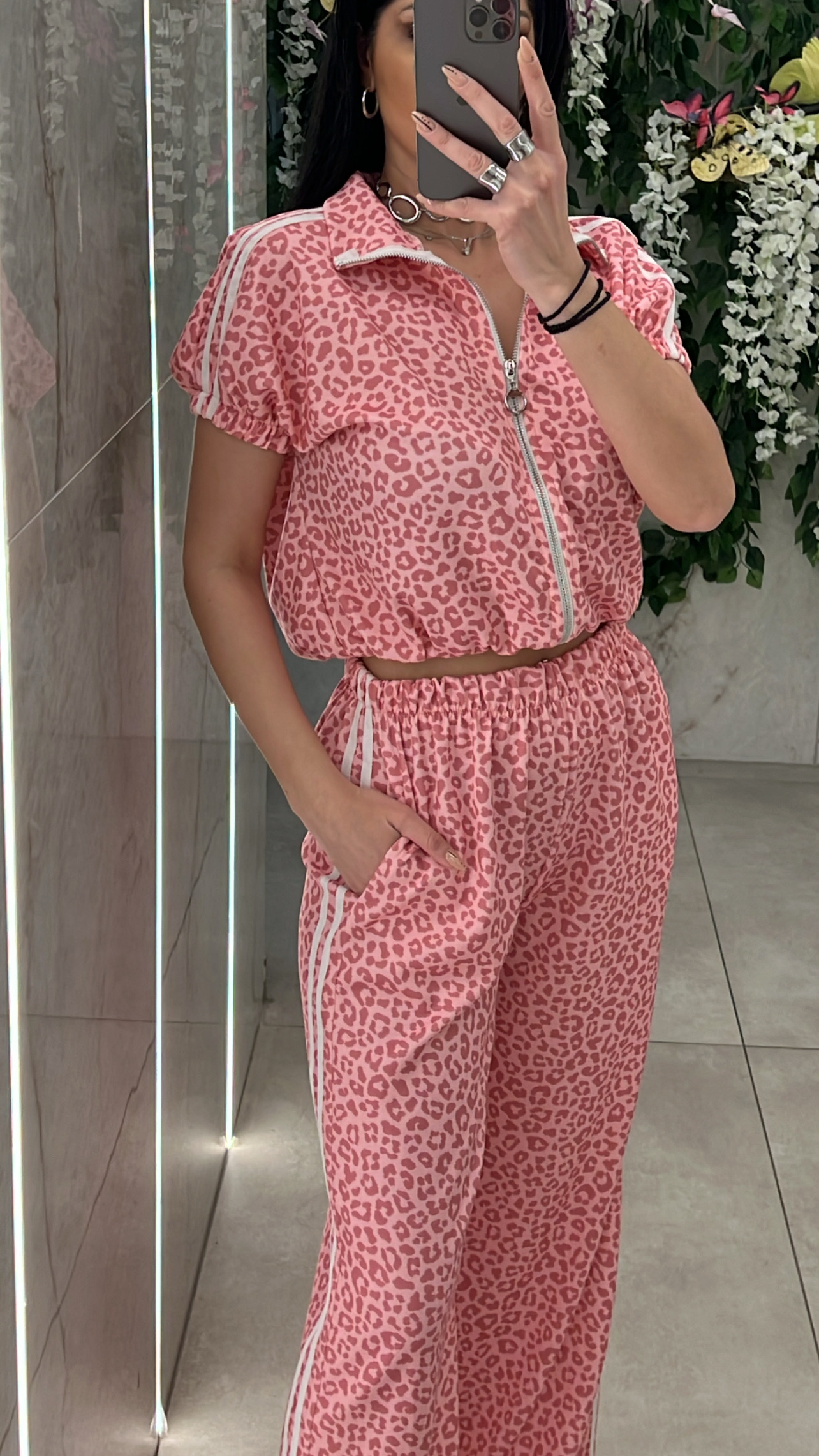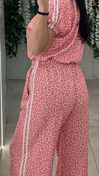 Σετ λεοπαρ ,ζακετα χωρις κουκουλα αμανικη με λάστιχο στο τελειωμα και παντελονα με ριγες στο πλαι ,τσέπες και λάστιχο στην μεση .