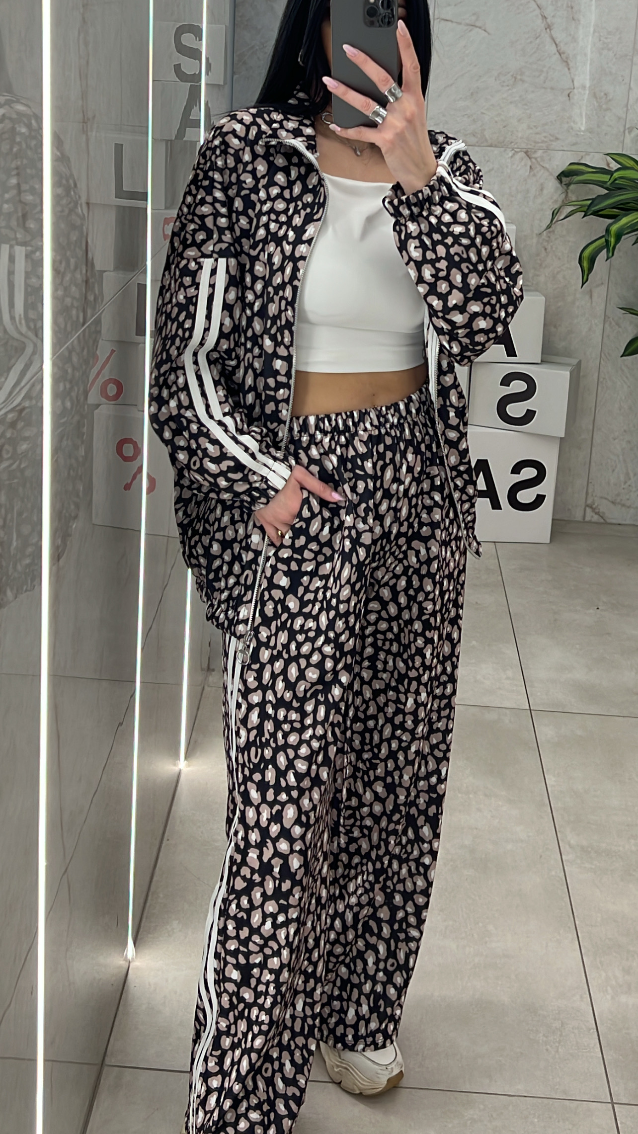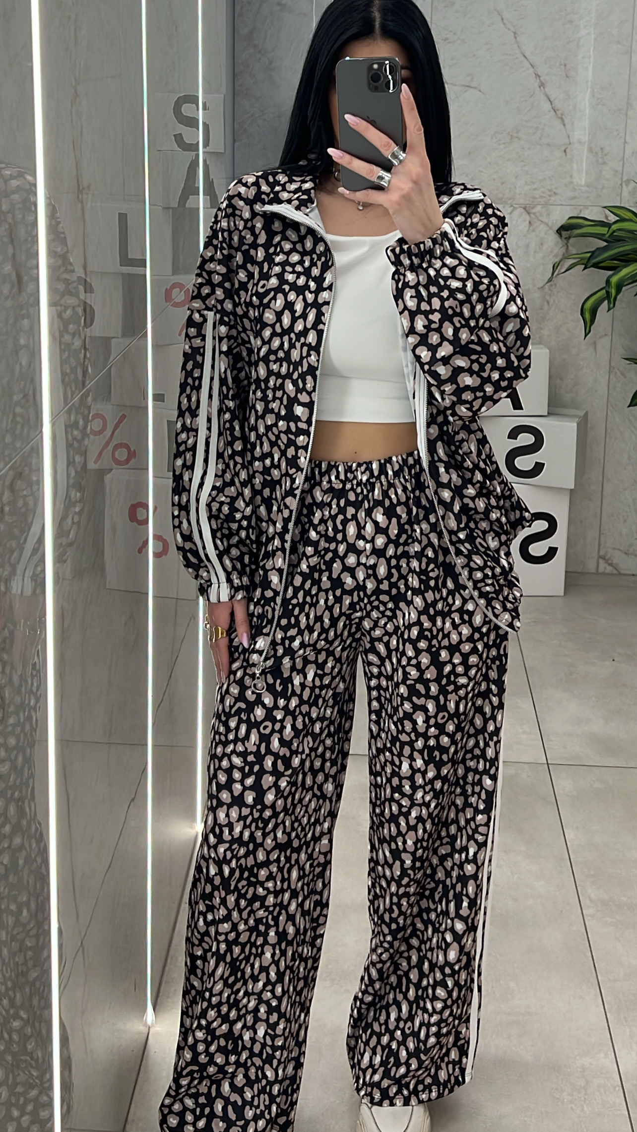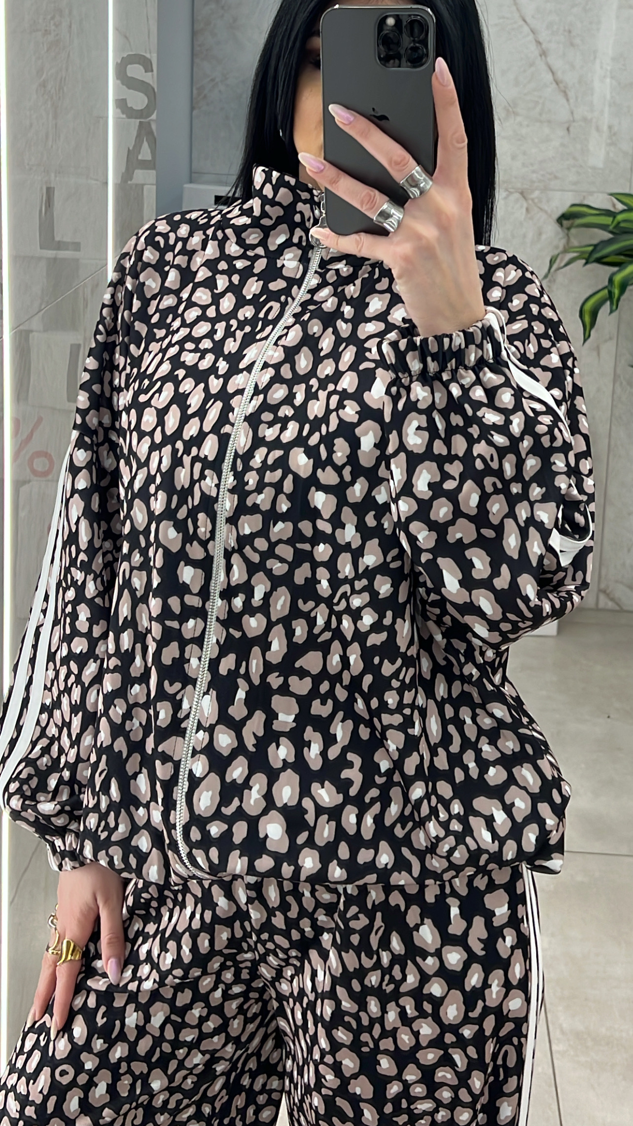 Σετ φόρμας λεοπαρ ,παντελόνα με λάστιχο στην μέση  και τσεπες και ζακετα με λάστιχο στο τελειωμα.