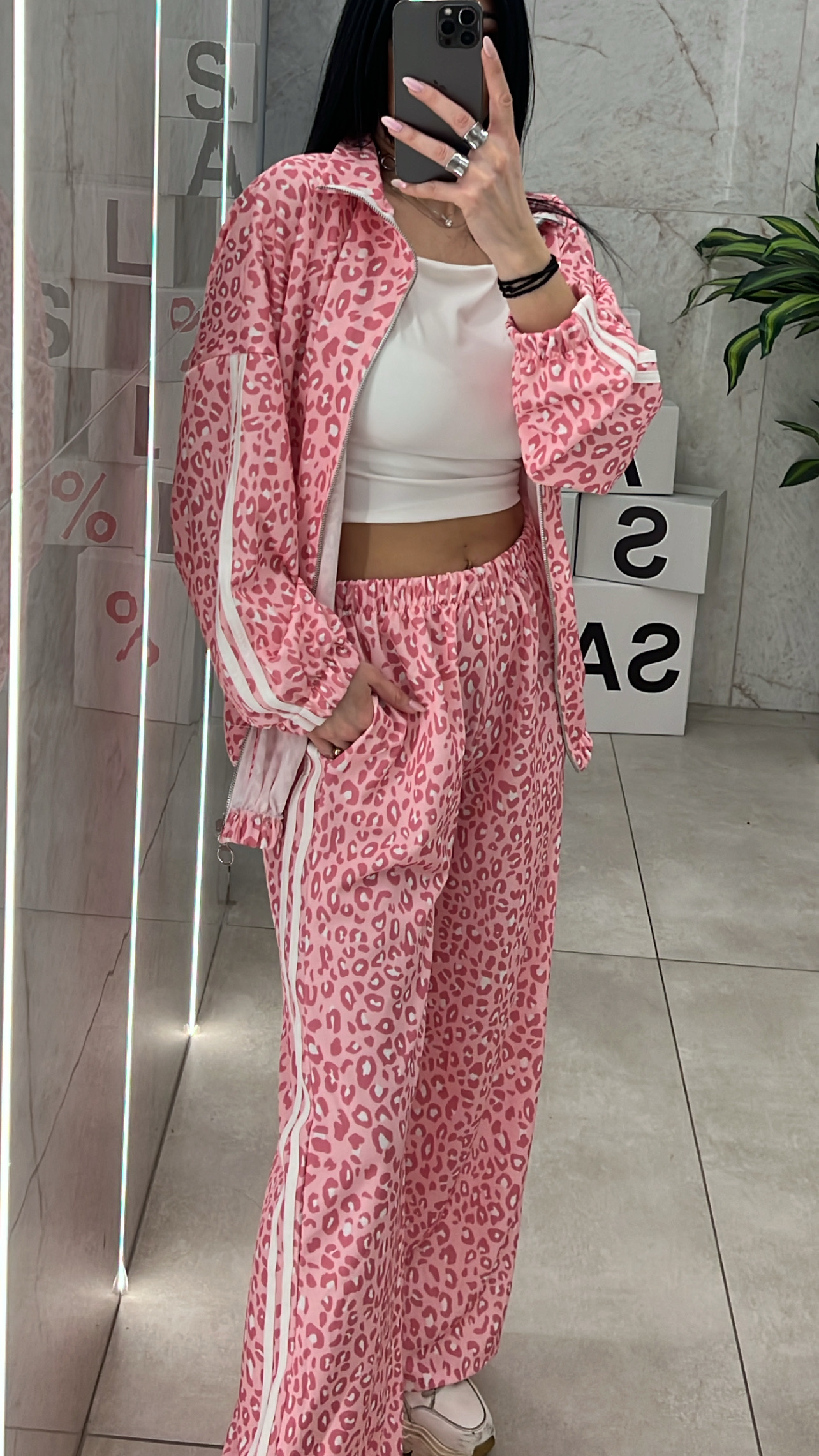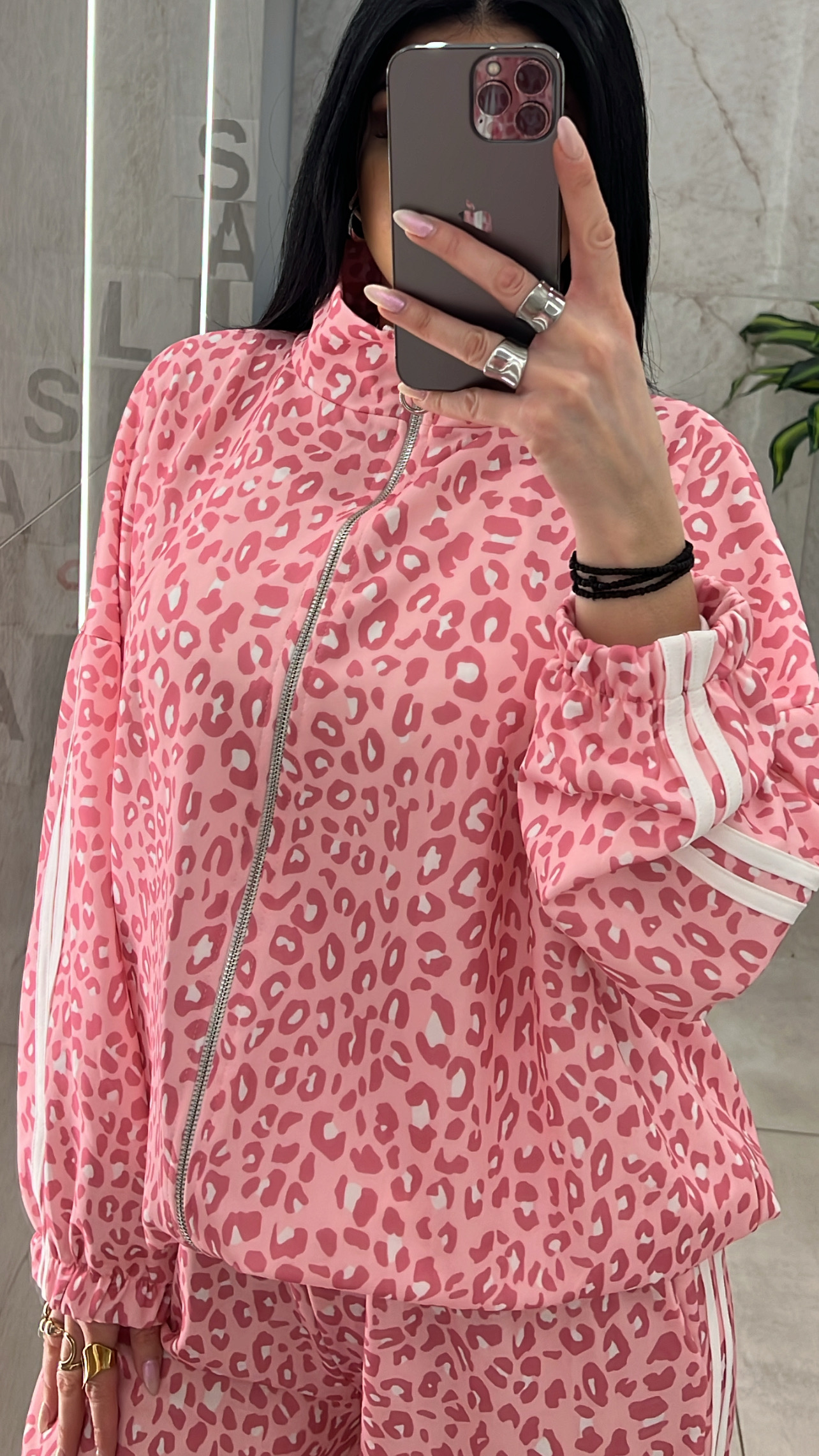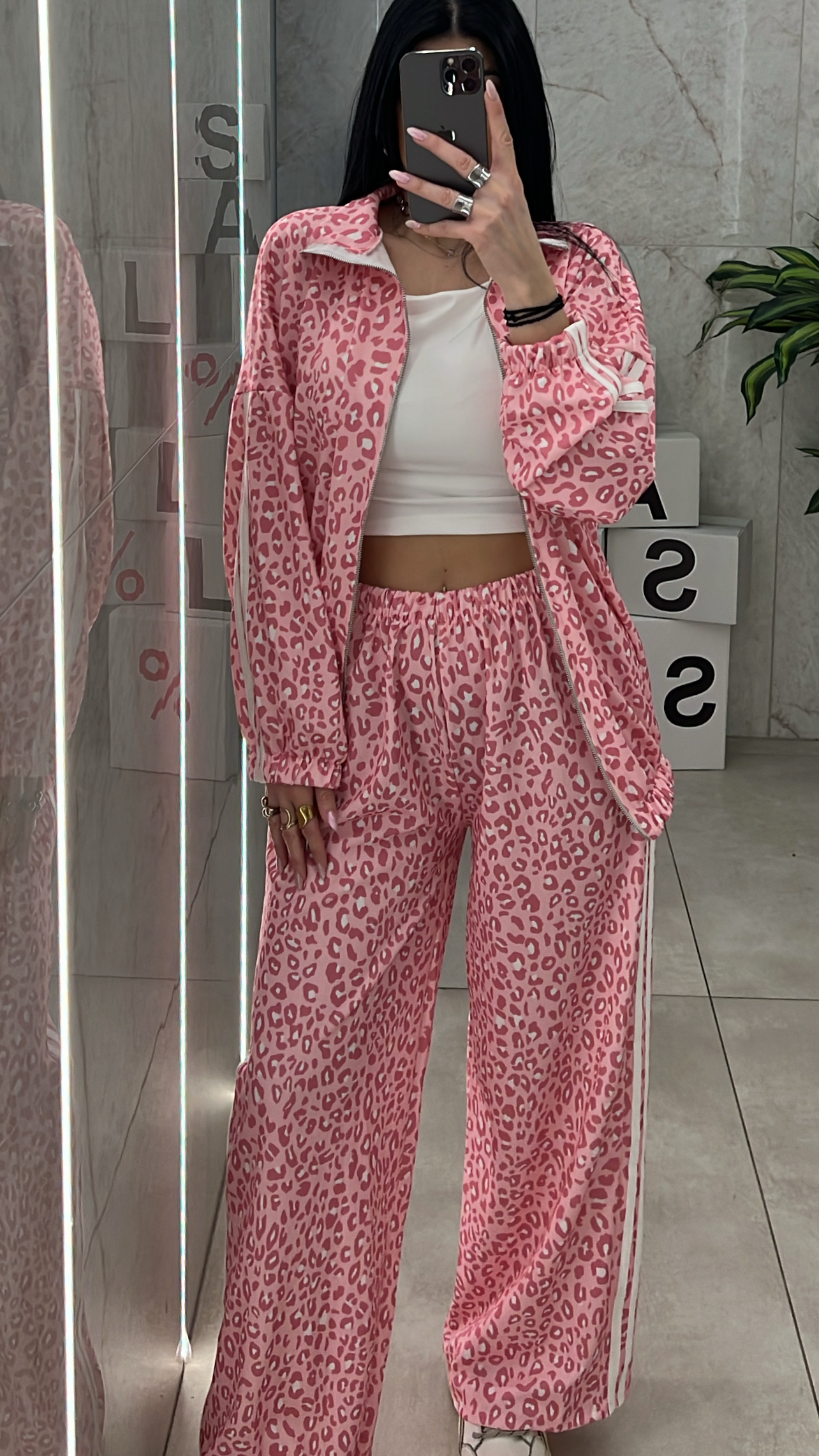 Σετ φόρμας λεοπαρ ,παντελόνα με λάστιχο στην μέση  και τσεπες και ζακετα με λάστιχο στο τελειωμα.
