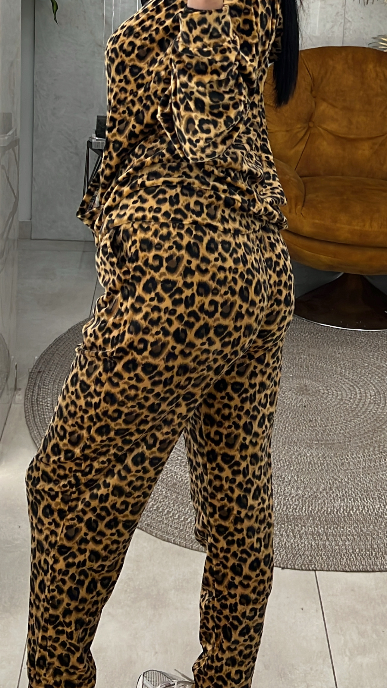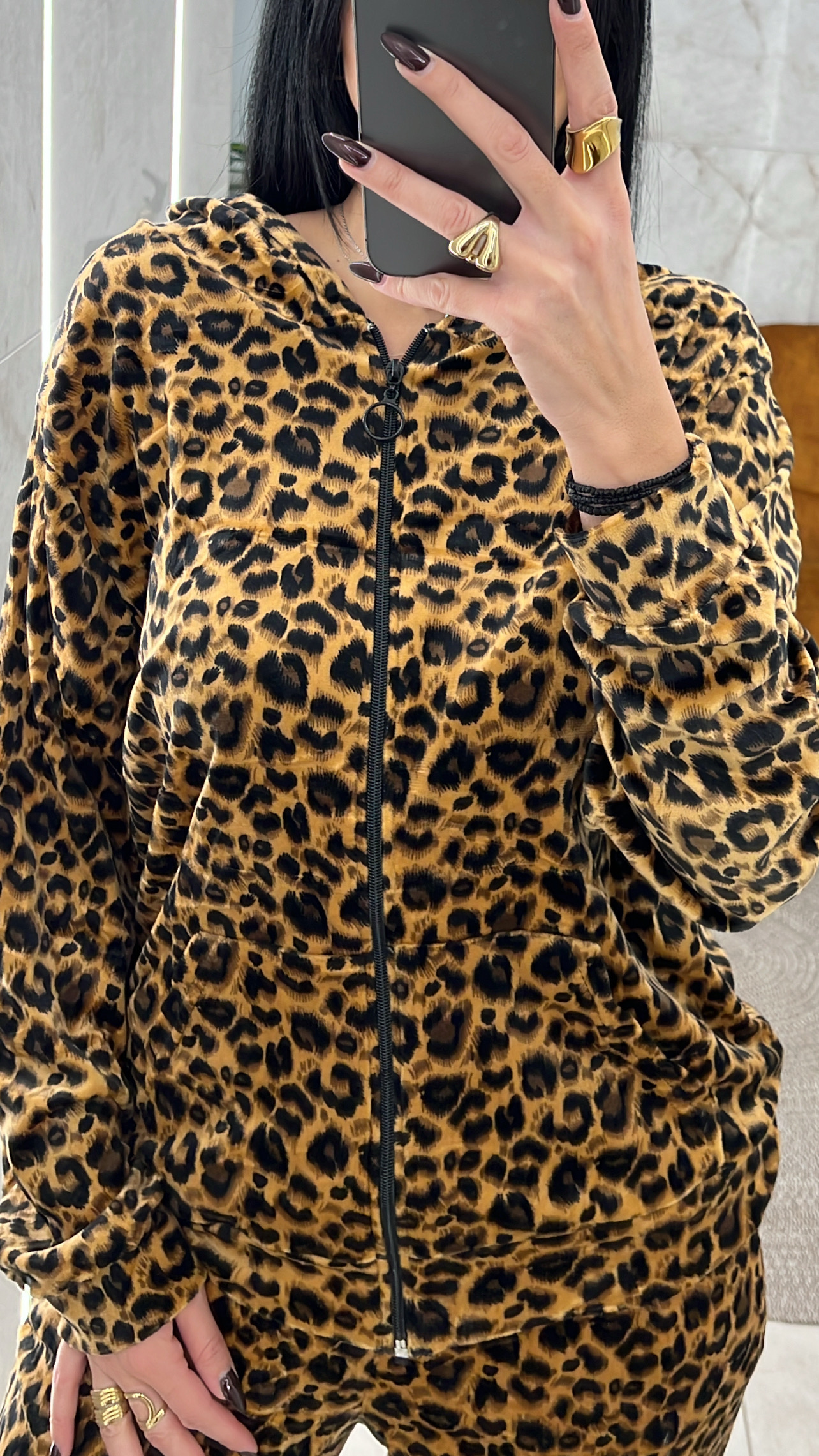 Σετ φόρμας Λεοπάρ βελουτέ με ζακέτα που έχει κουκούλα τσέπες μπροστά και κλείνει με φερμουάρ και παντελόνι που έχει πλαϊνές  τσέπες λάστιχο στη μέση και στο κάτω μέρος του παντελονιού