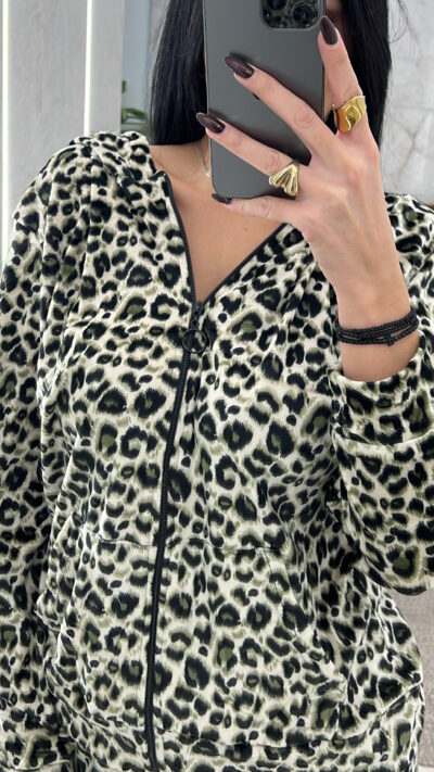 Σετ φόρμας Λεοπάρ βελουτέ με ζακέτα που έχει κουκούλα τσέπες μπροστά και κλείνει με φερμουάρ και παντελόνι που έχει πλαϊνές  τσέπες λάστιχο στη μέση και στο κάτω μέρος του παντελονιού
