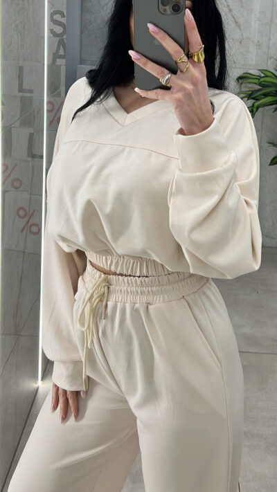 Σετ φορμας , μπλουζα κοντη με βε και λάστιχο στο τελείωμα και φόρμα με τσέπες ,λάστιχο και κορδόνι στην μέση .