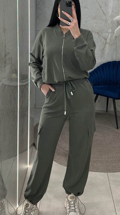 Σετ φόρμας Μao με ζακέτα που έχει λάστιχο στο τελείωμα της μέσης και παντελόνι με πλαϊνές και κανονικές τσέπες λάστιχο στη μέση και κορδόνι